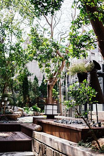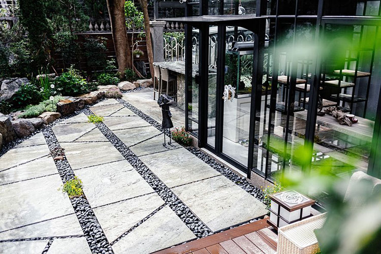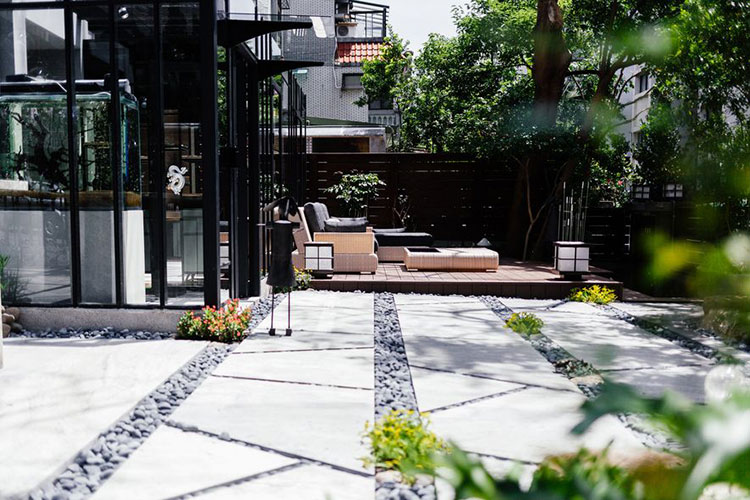 石材地坪的20公分縫隙,深度10公分活鋪卵石,作為地表保水與排水,夏天降溫,連續降雨也不積水方便行走。
