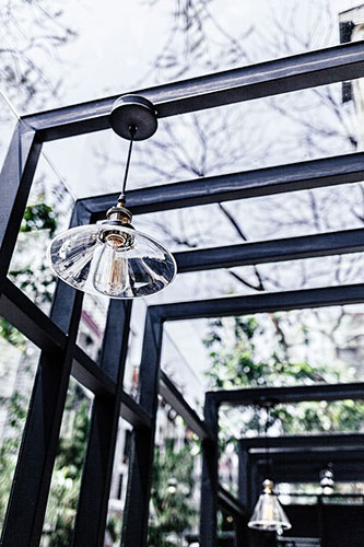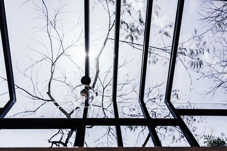 中間保留寬敞的活動區域,窗邊以大面玻璃加上L型鐵件比例分割,