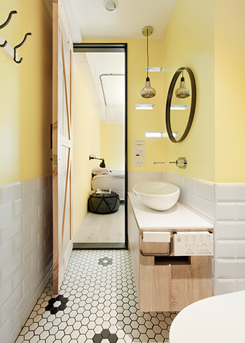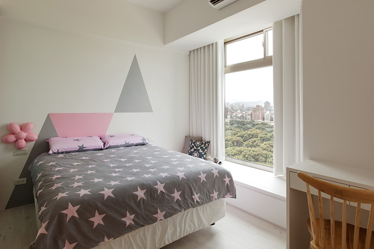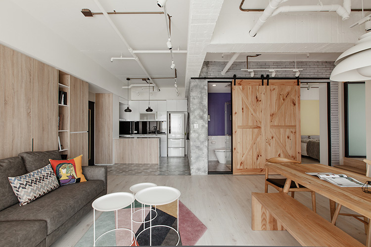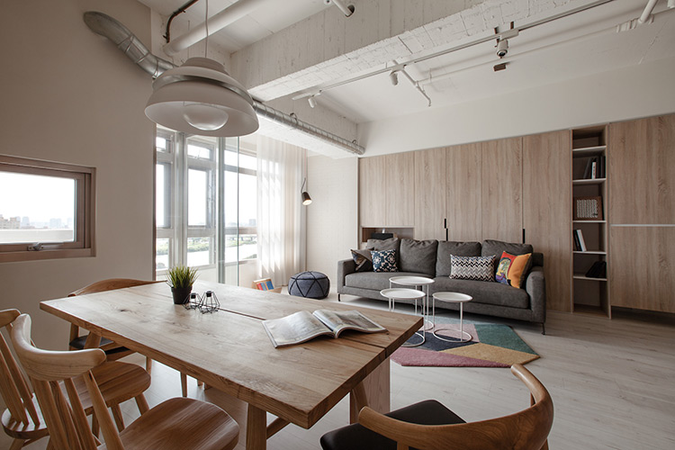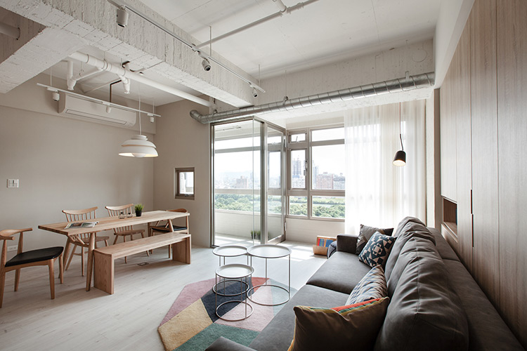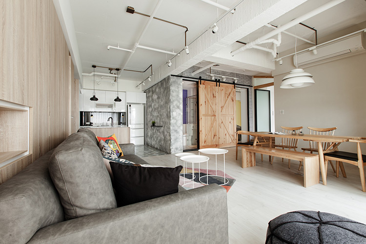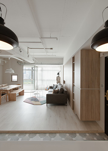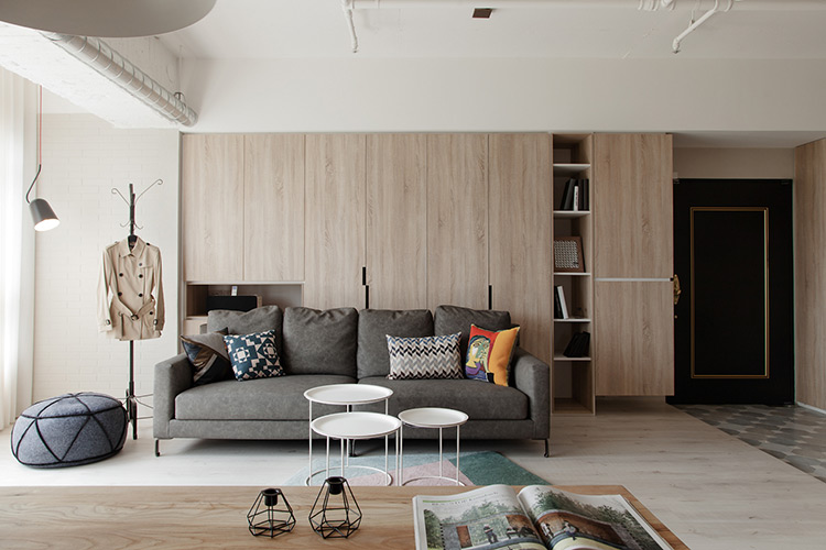 房屋位於高樓擁有絕美景觀,鬧中取靜的環境,因此設計師將主軸放在如何將窗景引進室內,達到放大公共空間的視覺效果。藉由唐朝詩人孟浩然的『春眠不覺曉,處處聞啼鳥』發想,希望屋主每天早晨都被嘰嘰喳喳的小鳥喚醒,讓大自然能在屋內每個空間流串。整體設計走的是北歐混搭風,將淺色系的白與灰,大範圍運用在牆面上,黑色則是重點式的點綴,如陽台邊的吊燈、滑軌鐵件,搭配溫暖的木頭元素如穀倉門、小木屋飾條,塑造出簡單又清爽的生活空間。