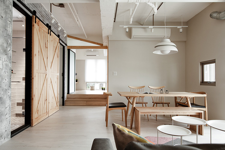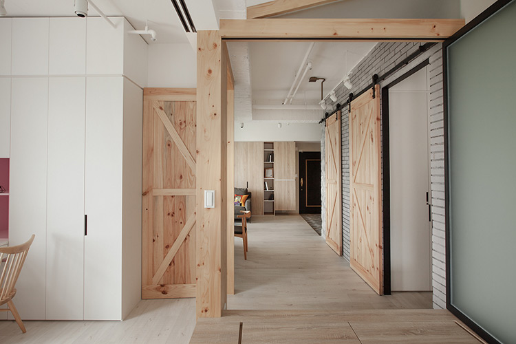 主要建材/ 松木原木、穀倉門五金、原有紅磚、鐵件、玻璃、系統櫃、人造石、軌道燈