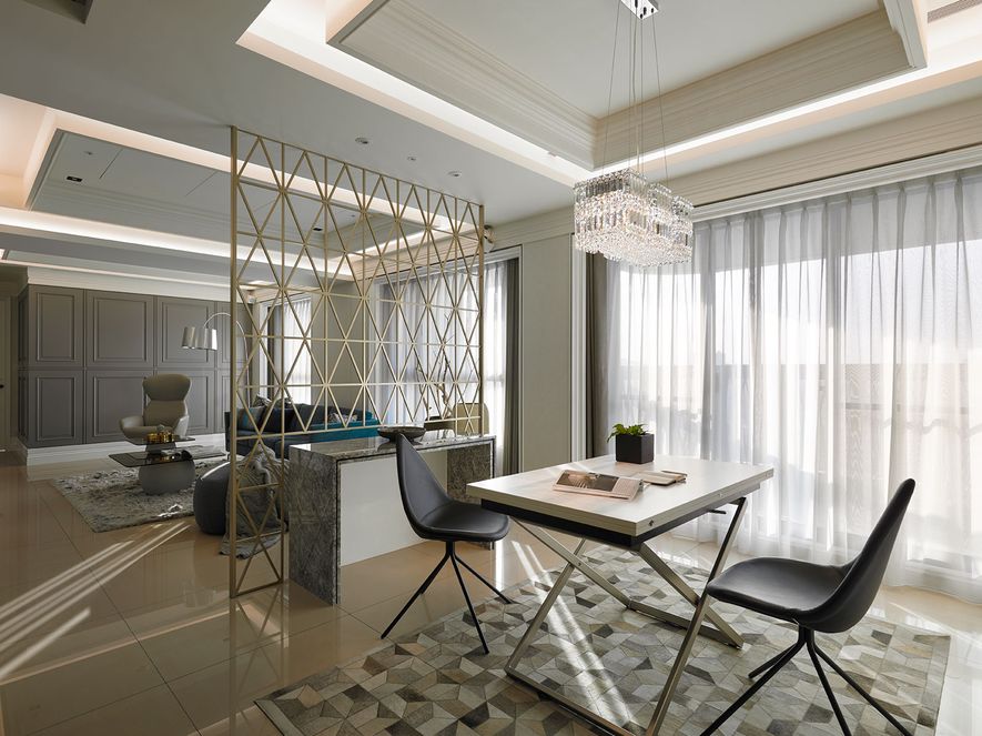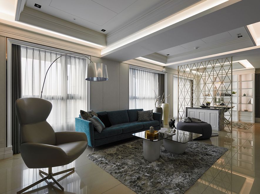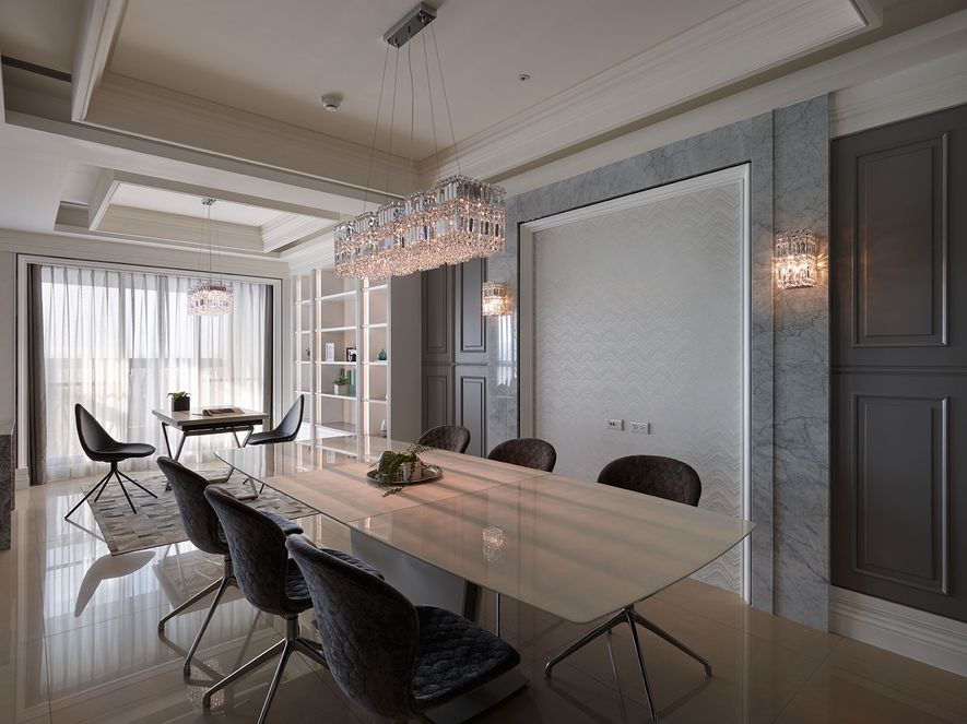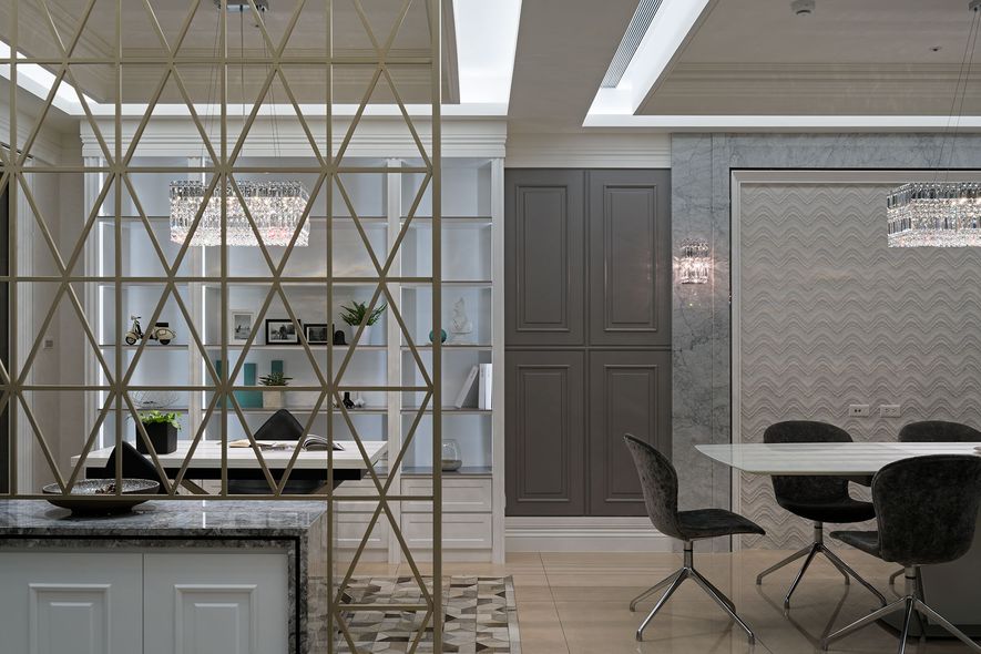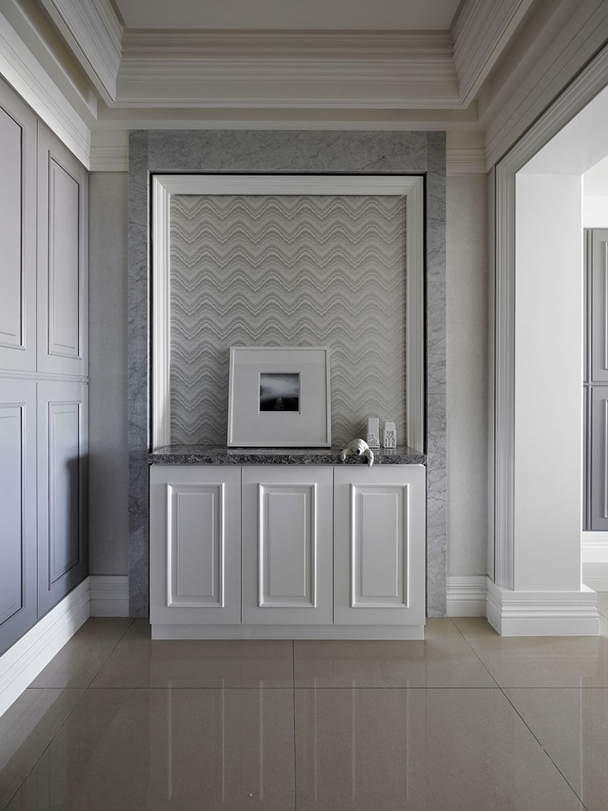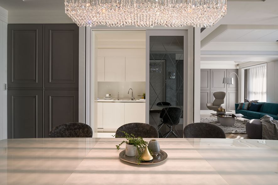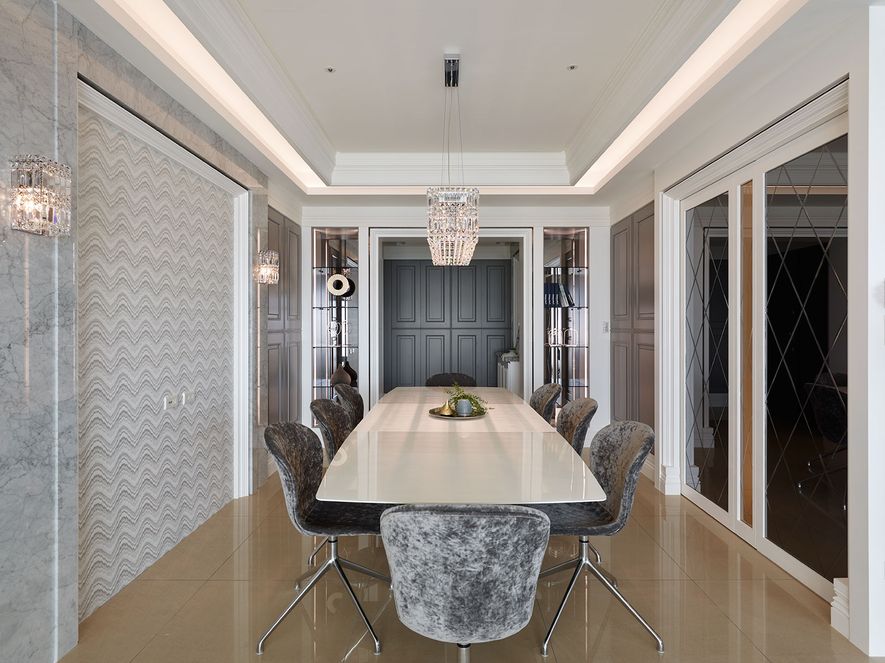 設計理念/ 屋主在台北另有其他住所,此屋為度假享受的空間。以灰白色為基底,並利用對稱性線版設計,在古典風格的基礎上增添了時尚的對稱美,打造優雅的度假居所。