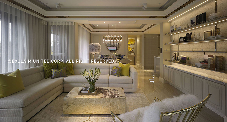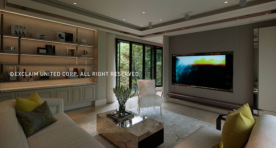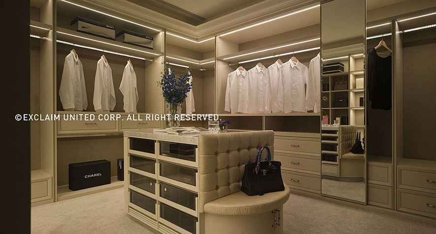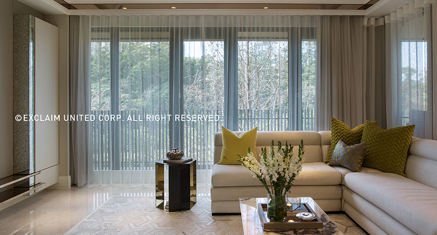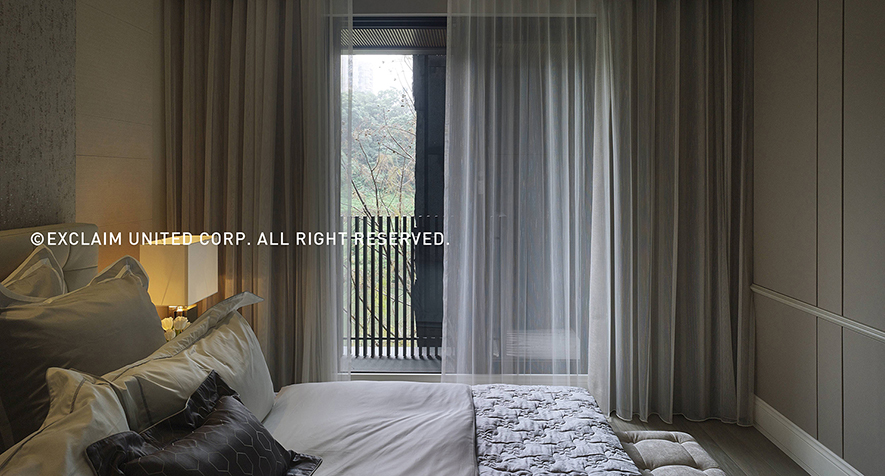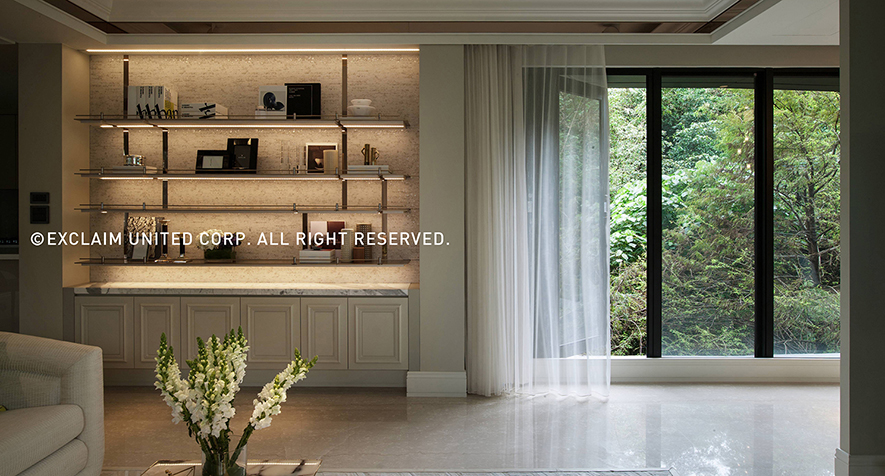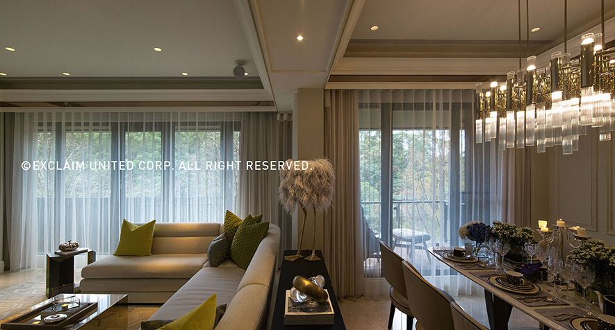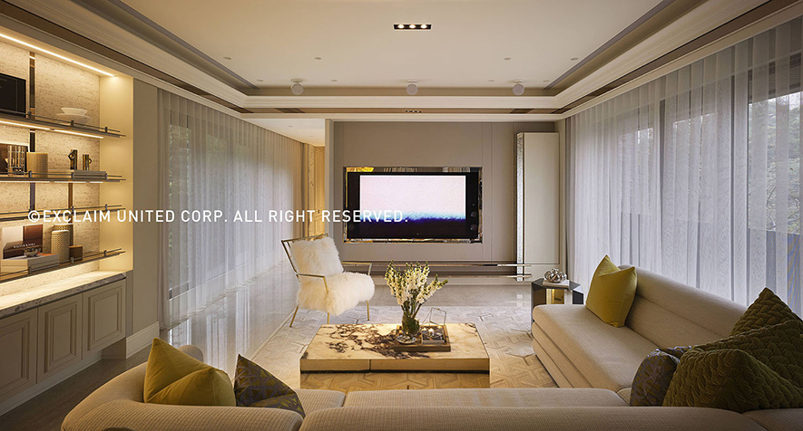 業主喜歡時尚、精品藝術,懷抱童心同時也渴望回歸簡約的調性,客廳除了選用鑲嵌金屬呼應編織結構的馬毛地毯,鴕鳥造型閱讀燈呼應屋主的童心未泯,牆面結構運用美式線板增加層次感,進口傢俱經過排列組合強調空間對稱性,結合美式簡潔和藝文需求,訪客一眼便能看穿屋主擁有的高雅品味和生活哲學,室內左右兩側採用大量落地窗,讓窗外綠蔭得以瀟灑的灑近屋內。更衣室方面,為凸顯屋主女強人的特質,採用中島設計,讓大量精品都可在一敞開門的同時清楚的被看見。