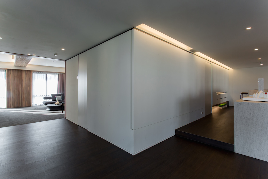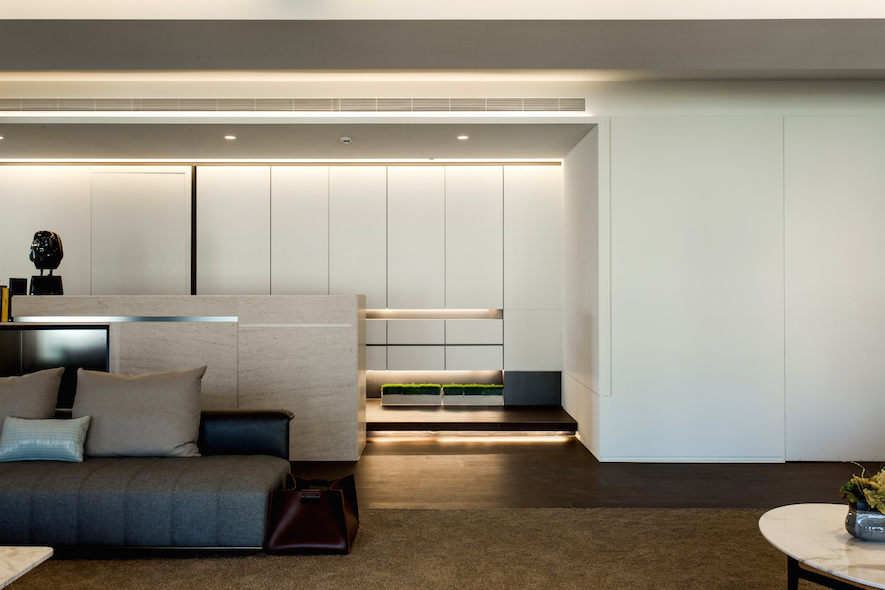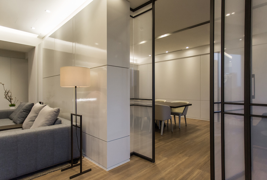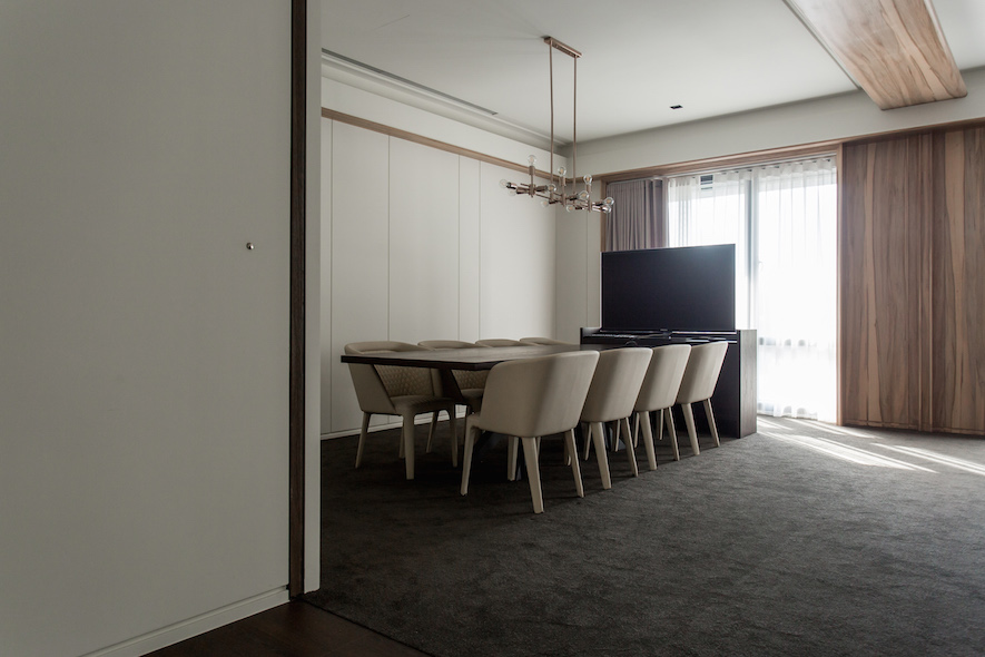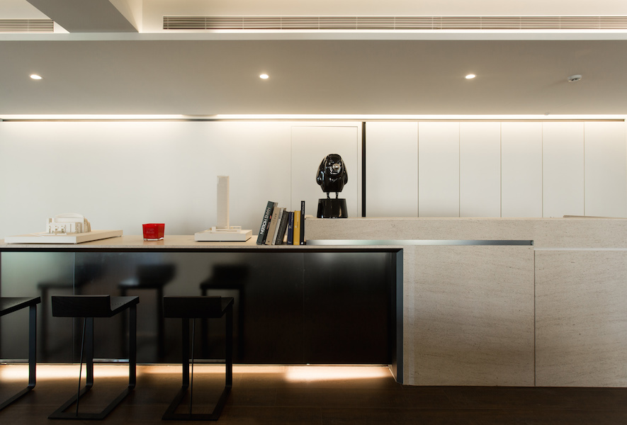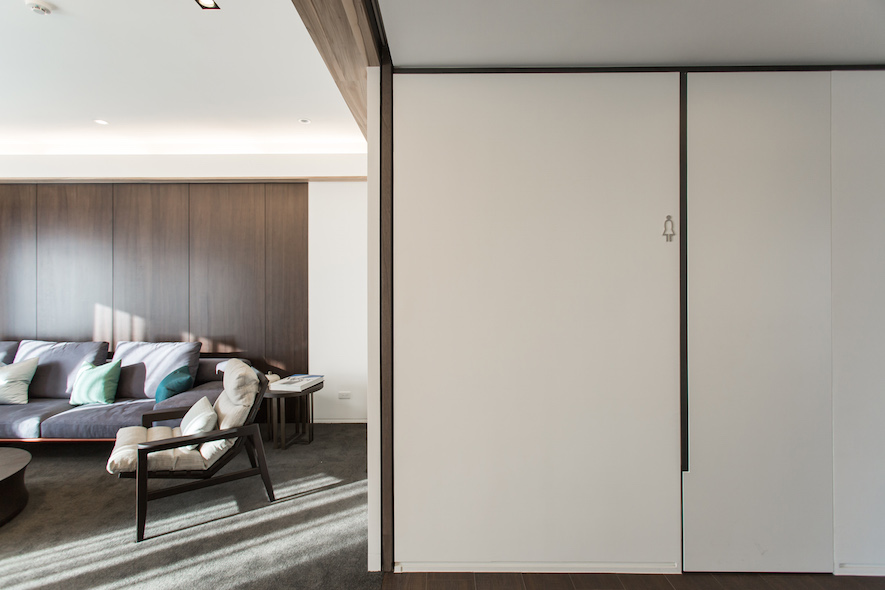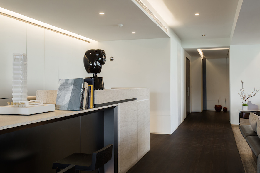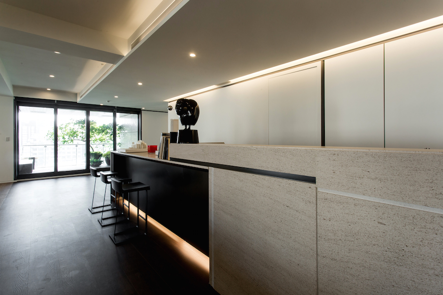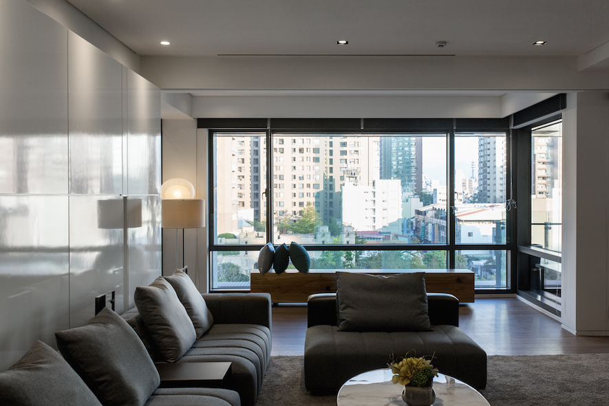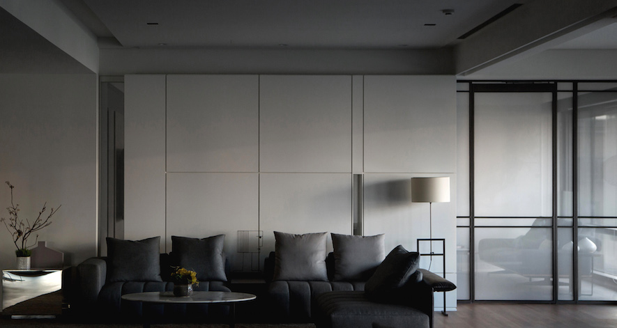 留白之美---照壁,如畫布在室內展演窗外光景的畫展,一貫的虛實、動靜,主從等概念來疊砌居室,輾轉將雋朗山水雕塑成空間線構,增減之間,都有著機能美學的推算。