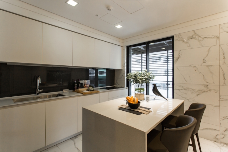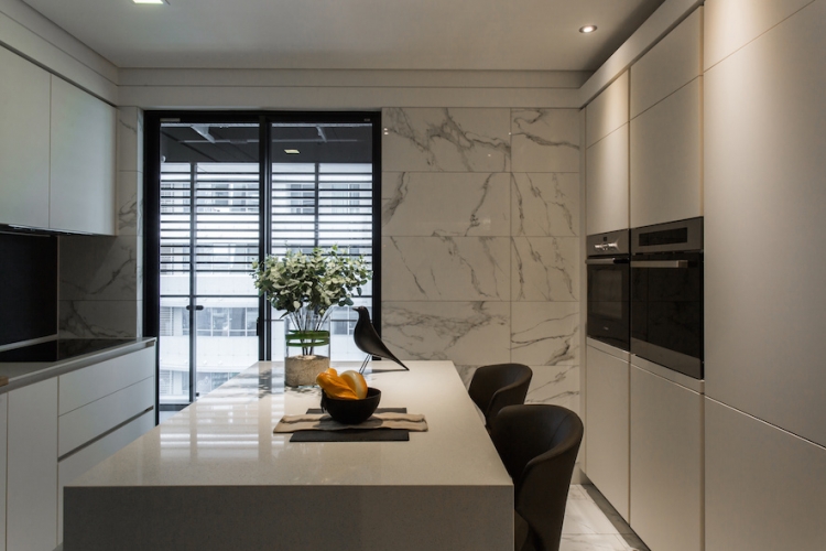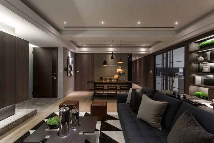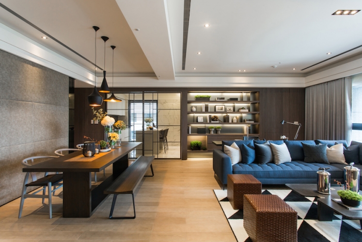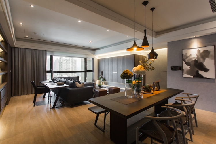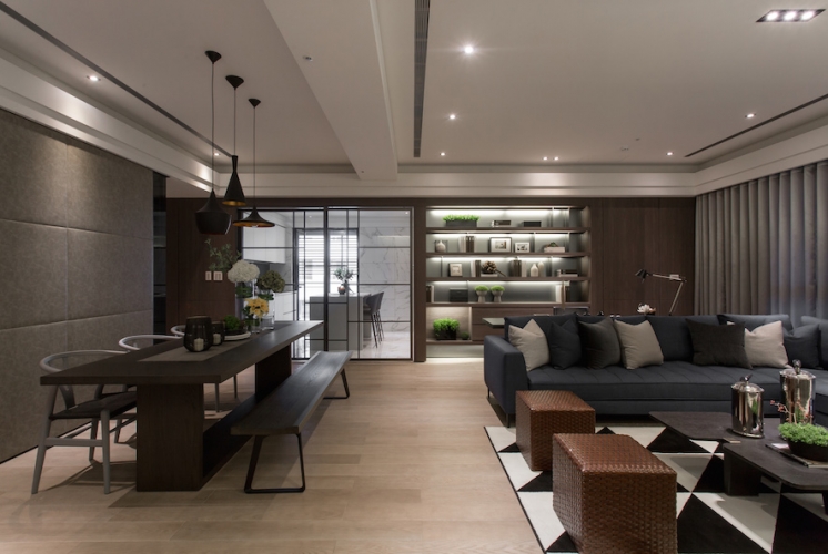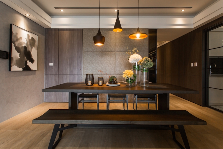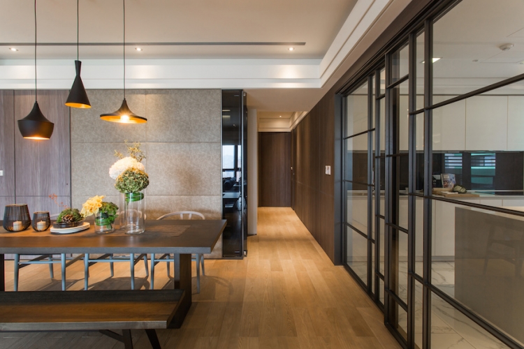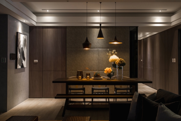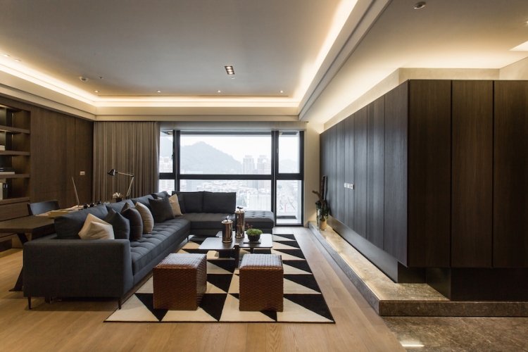 本案遠眺山景,建築設計於客廳中留出大面積開窗,視野極佳。自然光影的變化大幅增加空間的表情。為了引入更多的室外天光,我們採用金屬玻璃推拉門區隔成開放式廚房,使廚房落地窗的天光能透入室內廳堂,創造少見的兩向採光。最後,我們著重於雕琢飾面細部,利用深凹溝縫與金屬烤漆件使牆面具有立體感與細節。遠觀為大方、明朗的空間,近觀則為內斂優雅的紳士。以此創造出一種融合自然樸質與洗鍊現代的空間氛圍。