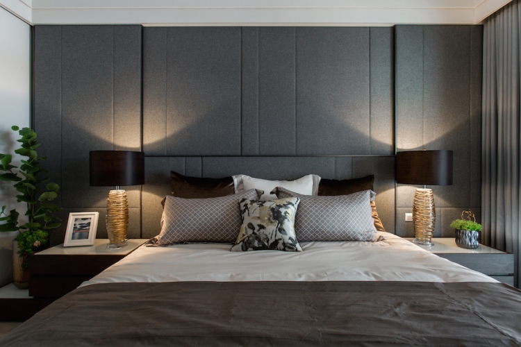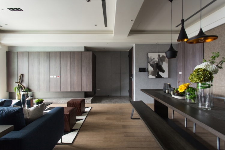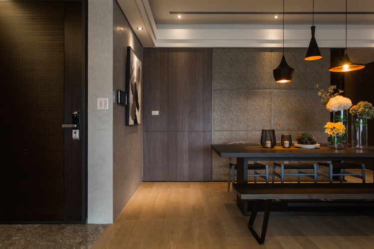 為了避免簡約空間過於疏離冰冷,主要壁面如採用木飾質材,金絲柚木厚皮鋼刷木皮染灰。地板則採用實木深刻紋栓木染色地板,渲染空間的暖色溫度。餐廳主牆則採用大地色系繃皮皮革作為過渡。其餘牆面,如廚房則予以白色仿石磚,如玄關與餐廳牆面採用淺灰色馬來漆、走道另向牆面採用白色噴漆或玄關地坪連結電視台面,採用灰網大理石,客廳落地窗搭配銀灰色布簾與雪白色羅馬簾…等等,皆以各種不同淺色階之材質。以此或留白或弱化,以讓出呼吸的空間,凸顯木質的溫潤,並使空間富有層次感。