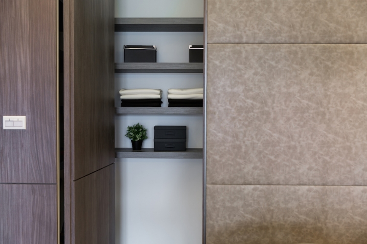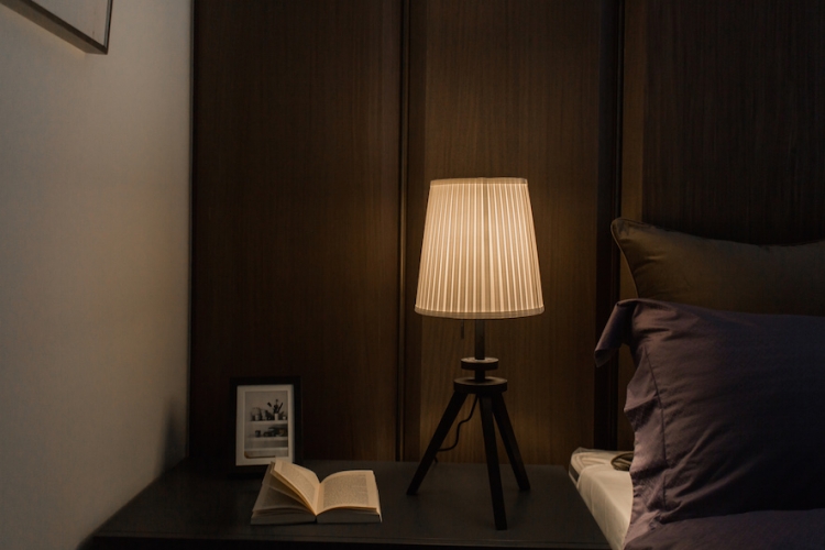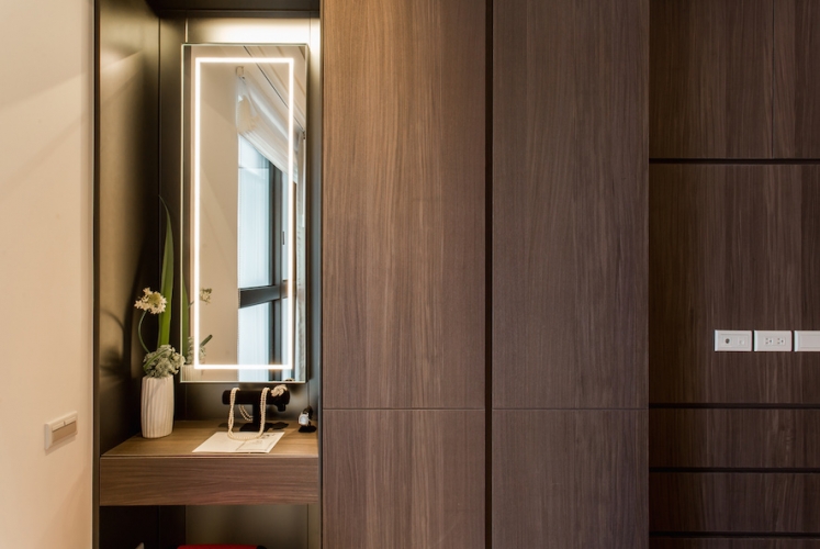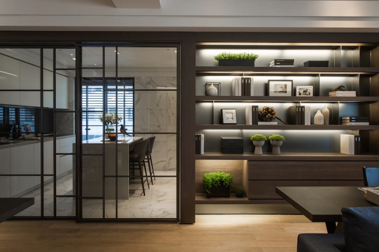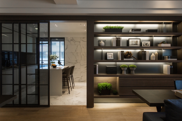 在此前提下,我們採用了幾種手法。首先是線條,無論是俐落的直線或舒緩的橫線,皆是簡約風格的重要元素。與地面垂直的直線,有如樹木一般,對抗重力奮力向上生長。直線因此蘊含自強不息的人文精神。本案以直線作為最主要的設計語彙,賦予空間剛健自立的精神氣象,寧靜的橫向線條以為輔助。空間中的每一條直線皆經過等距排列或疏密變化的研究檢討,使創造立面的韻律感。在連通所有空間的過道,本案最長的一道木飾牆面,設計等距排列的直向溝縫,作為空間的基調與穩定感。書房直立金屬層板則設計為小尺度的錯落排列,以與走道牆面作為疏密虛實的對比。