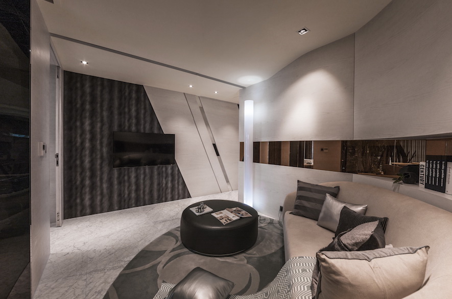 電視主牆以優雅的弧形線條,展現設計與機能兼具的特性,在流動量體的美學,使流暢且優雅的弧線結構,順著圓弧線條的設計,讓整體空間的視覺張力更加完美。延著弧形線條所雕塑出的天花板造型,運用黑白極簡的色調,調和出生動的韻律層次,使空間更加寬敞舒適。天花板與主牆的線條呼應黑白色為基調產生的對比,勾勒出弧線的流動感。使整體空間充滿現代時尚感,讓視覺有不同的感受。