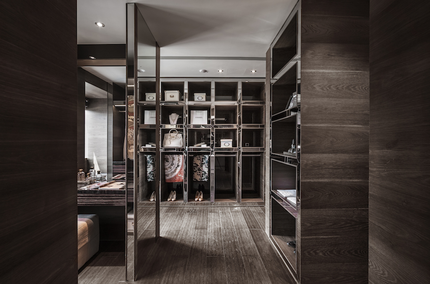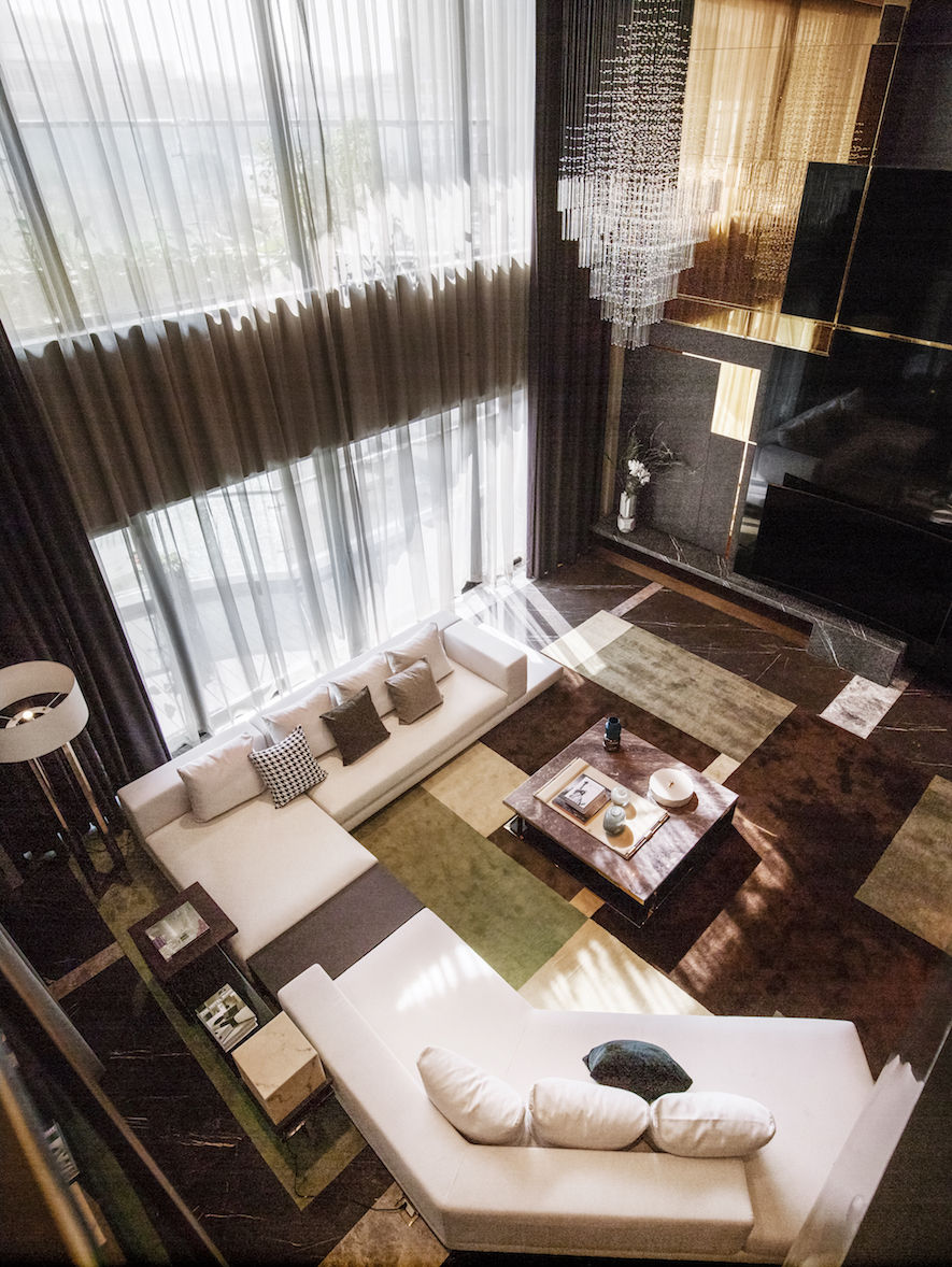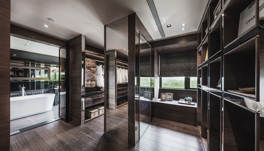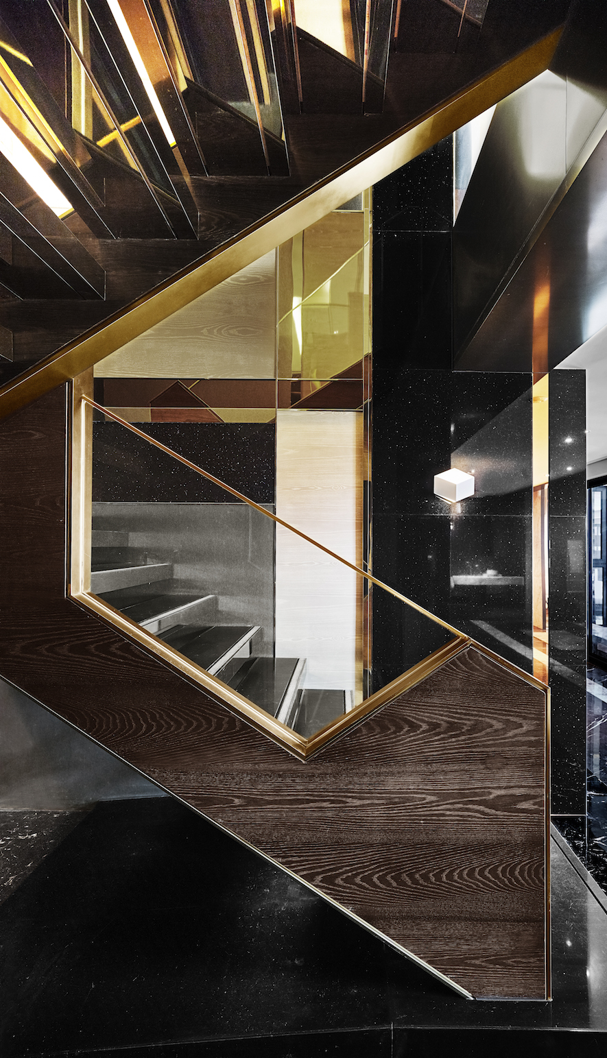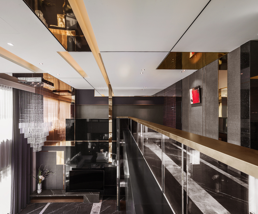 主客廳同時由多個不同幾何造型切割交織所組成的電視牆體,牆面的垂直水平線條對應天頂交錯的幾何量體,大理石材質的天然線條隱約在美術性的荷蘭風格派的語彙裡。有如屋內聳立的現代雕塑,使屋主在返家進入客廳,總需如親身閱覽影格般,欣賞此一魔幻的空間。深邃卻又明亮,地面上華麗的大理石搭配剔透的水晶吊燈,勾勒出電視牆俐落的線條,延伸著華麗與時尚的牆面,營造出豪宅氣勢的底蘊。