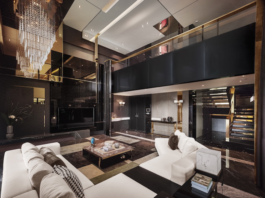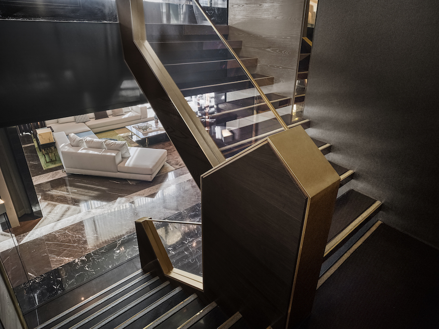 充足的日光從屋外迎面而來,映入眼中的是富有幾何造型立體變化的天花板與大面積的黑色拋光大理石地面分別佔據天與地,將華貴兼具時尚的氣韻,綻放出智慧的品味。