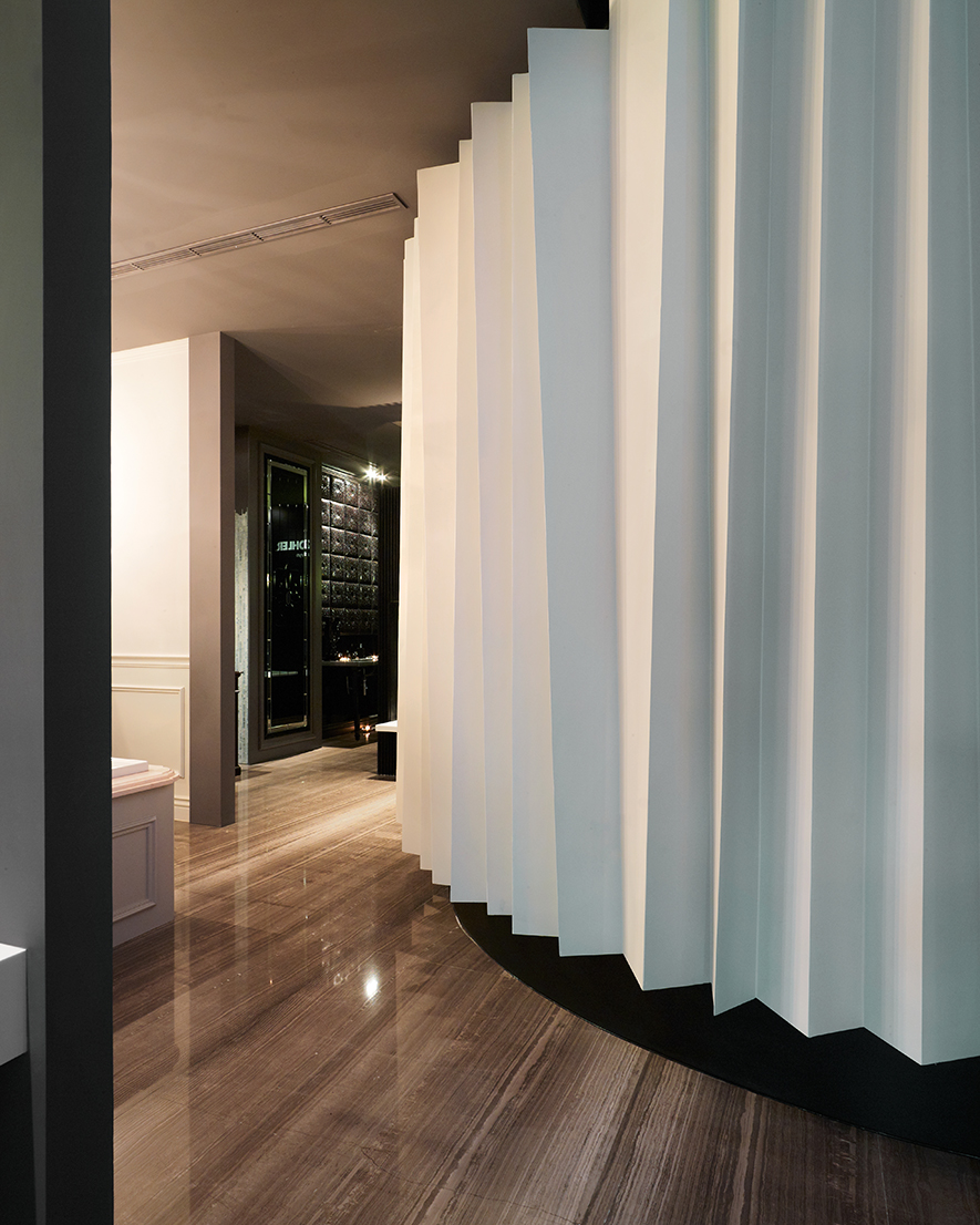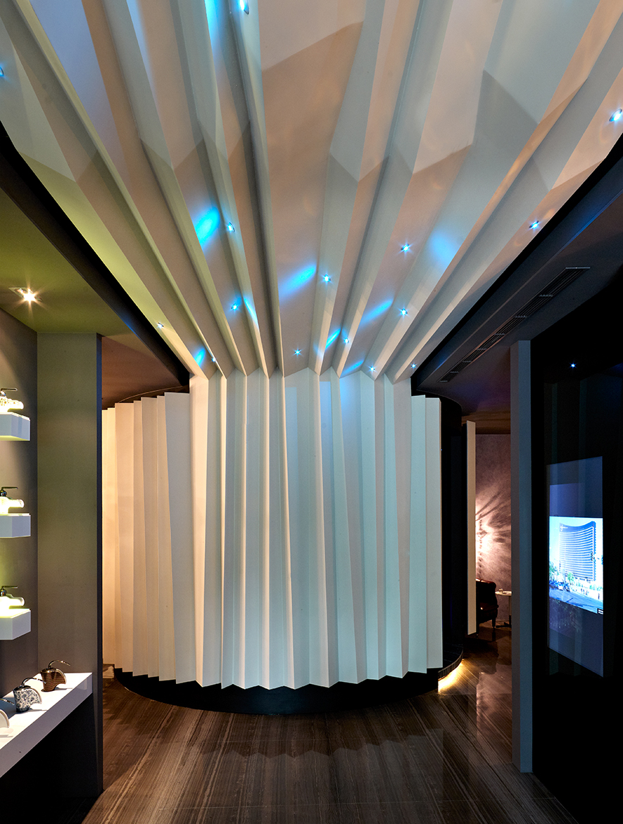 在室內的展示空間裡,設計師因應不同的產品特性,賦予不同的呈現方式,當中材質的運用與搭配更是需要運用設計者多年的經驗加以融合。