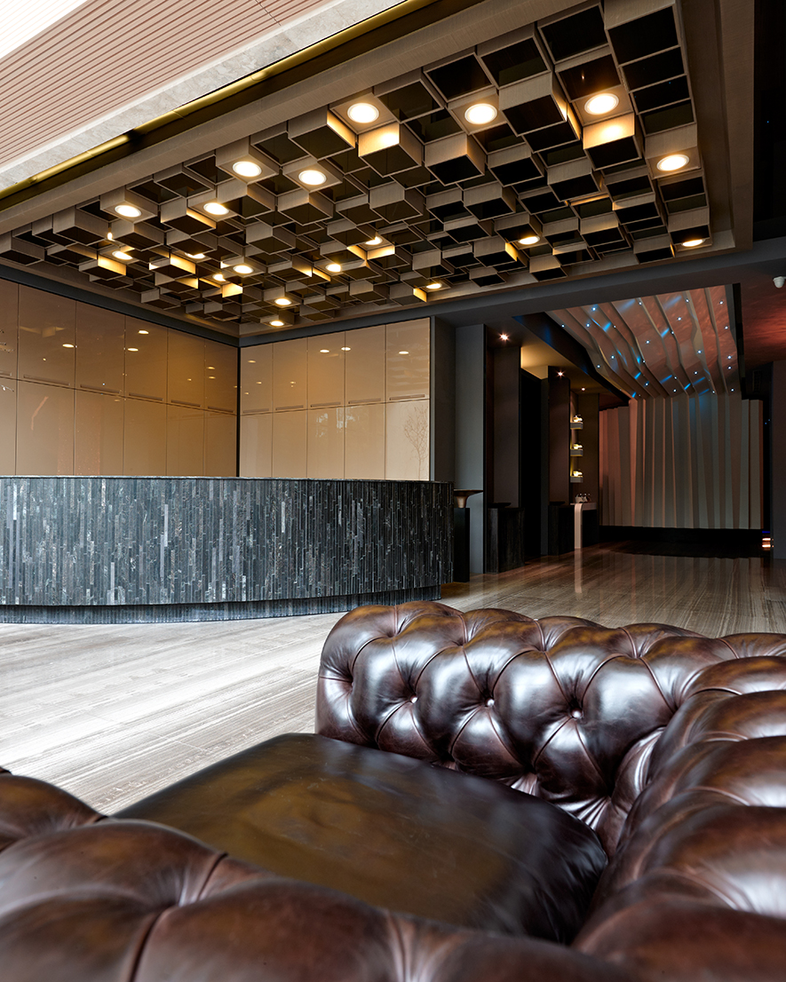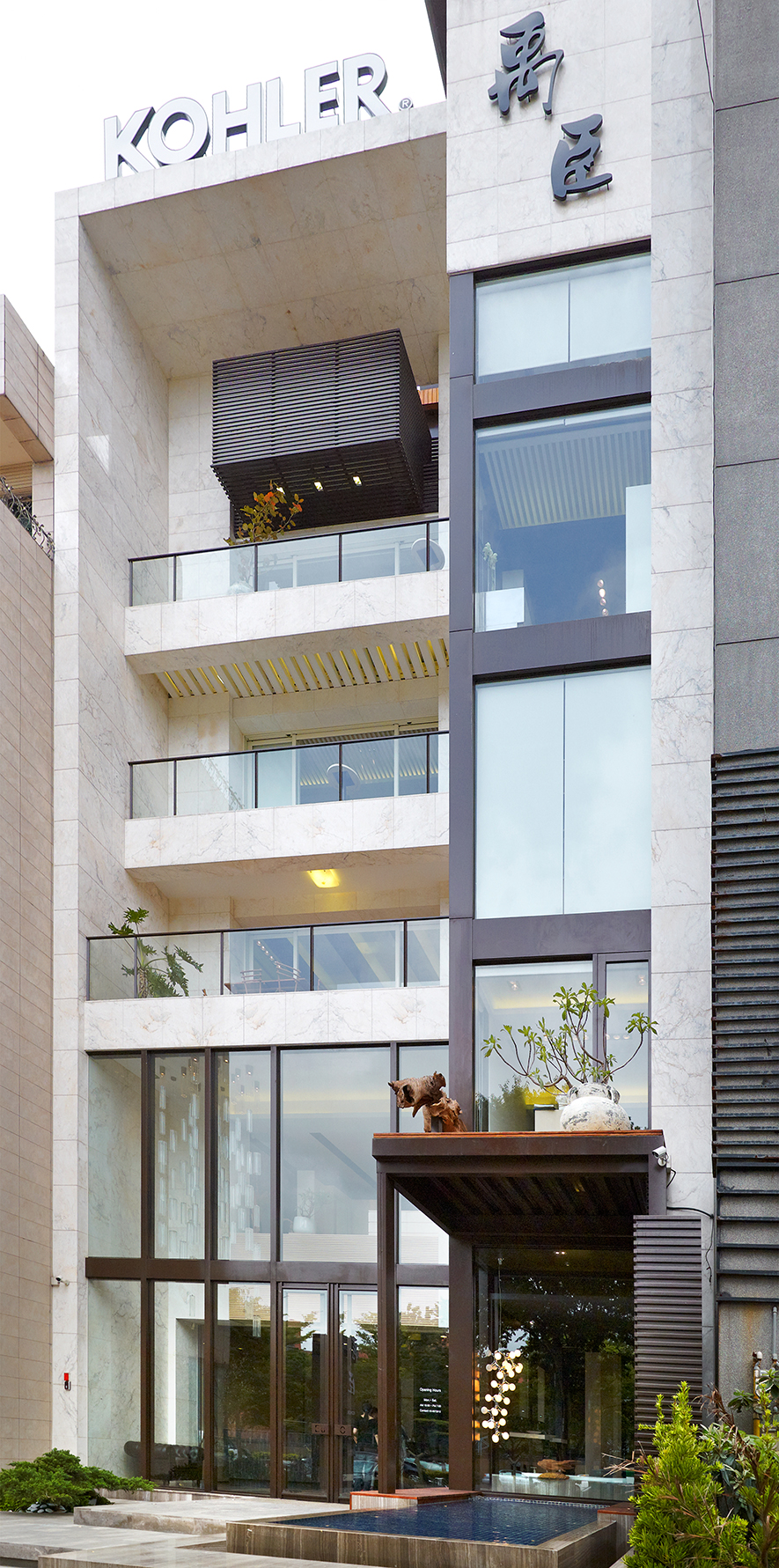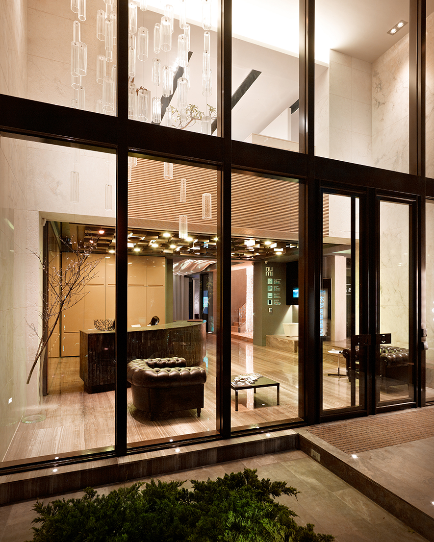 米白色的石材牆而配合大量的大片玻璃,讓建築量體顯得輕盈通透,無論白天或夜晚,都釋放出一種無壓力的優雅。