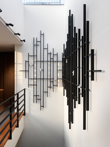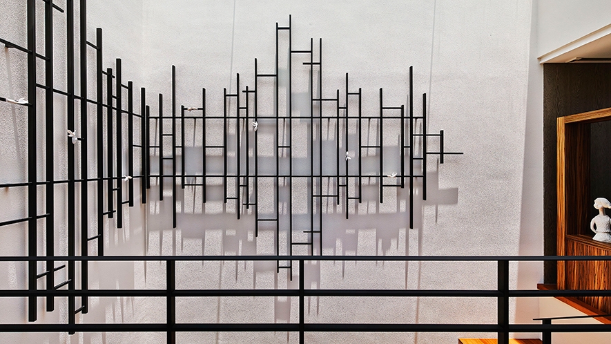 也可以是鐵件雕塑品+白牆+光影的舞台,隨著光影的變化上演著不同的戲曲。