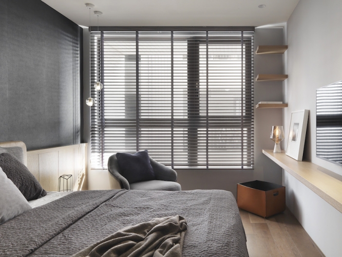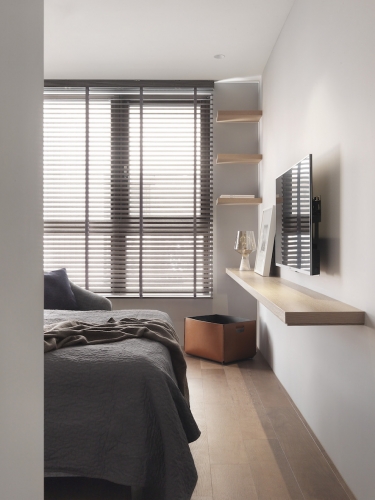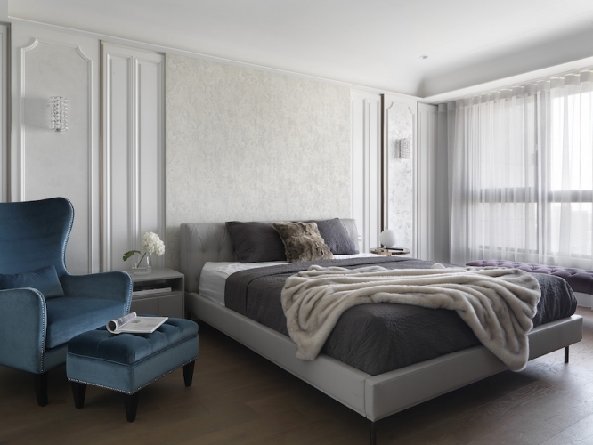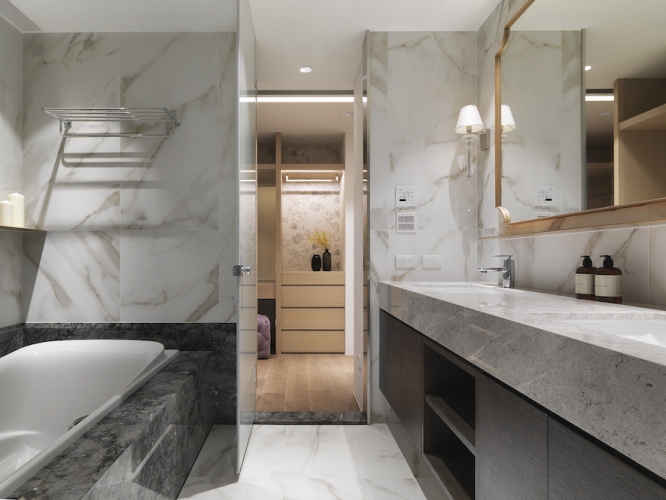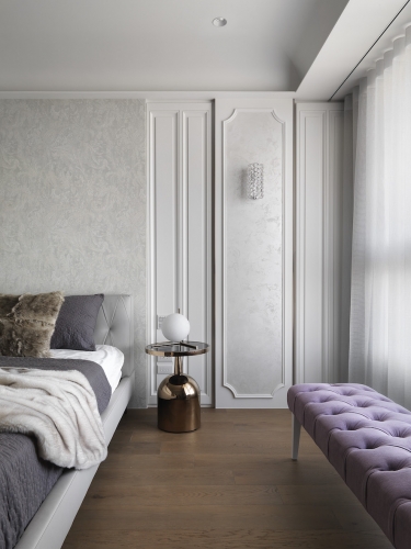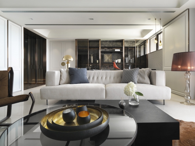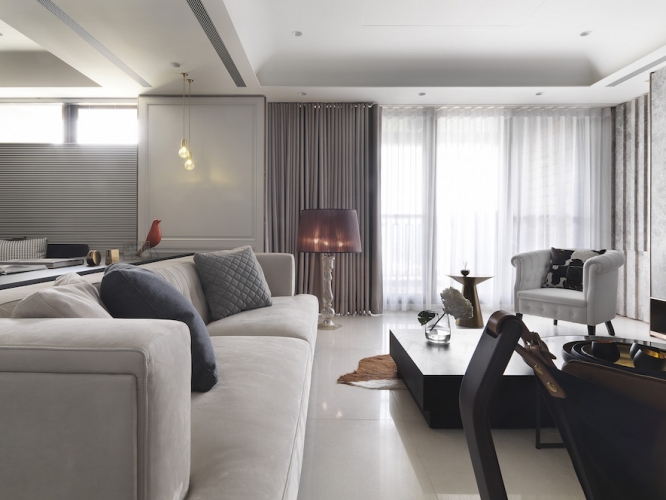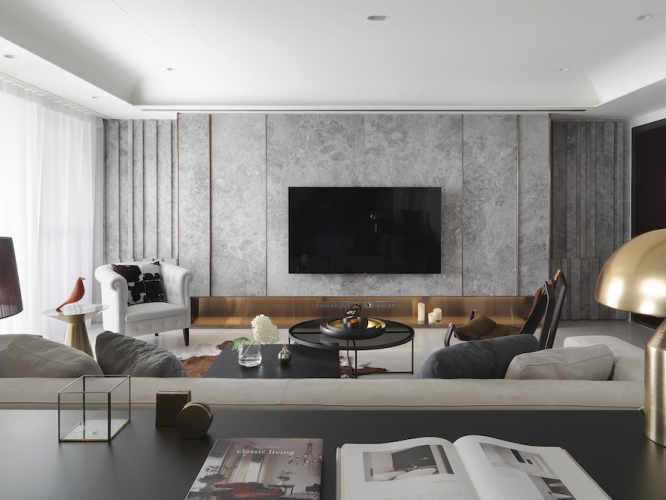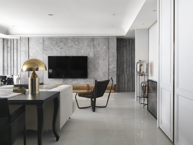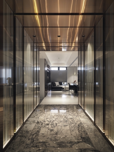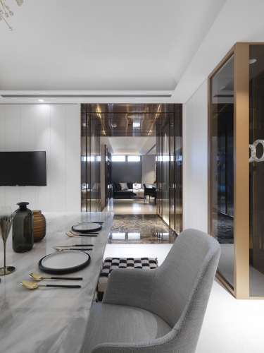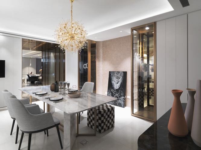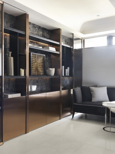「收納、美觀同時具備!」這是夫妻倆對於新居最重要需求,因為藝術擺件眾多、希望有展示平台和足夠存放空間,因此執行總監Tina與設計師Irene在住宅展示櫃配置不手軟,客廳、書房與餐廳都能看到屋主匠心獨具的收藏品,讓佈置作為空間第一道視覺焦點;同時也考慮到有長輩同住,家具弧度、室內動線均有悉心安排。由於此案位處觀音山,住宅又是高樓層,在居家空間上也仿照自然風景漸進式層遞美學,以石材、鈦金、鐵件等材料漸進鋪排,融合兩人喜愛的金屬、古典元素,呈現居家高品味層次。