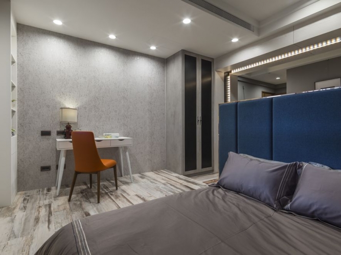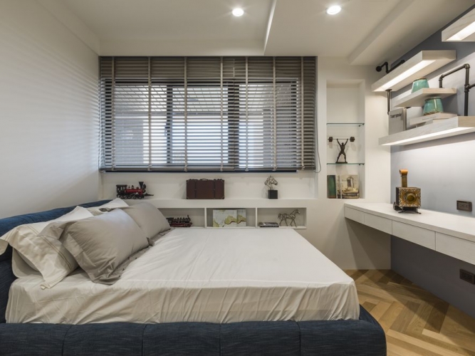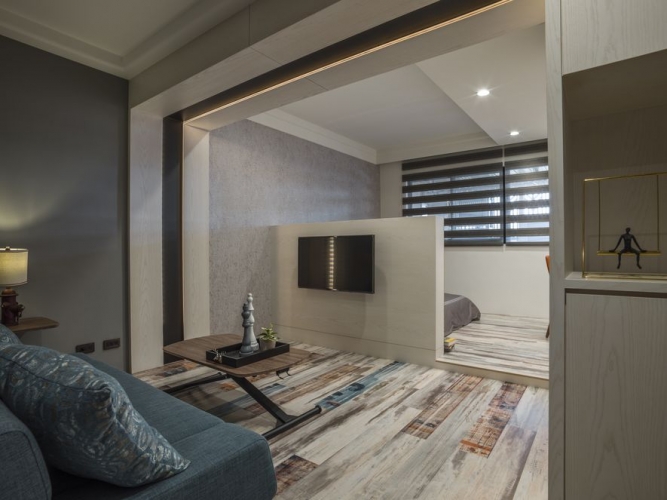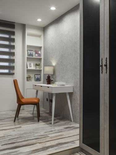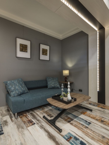 日本特殊壁紙、金屬美耐板、消光黑鐵件、環保漆+調色漆、實木木地板