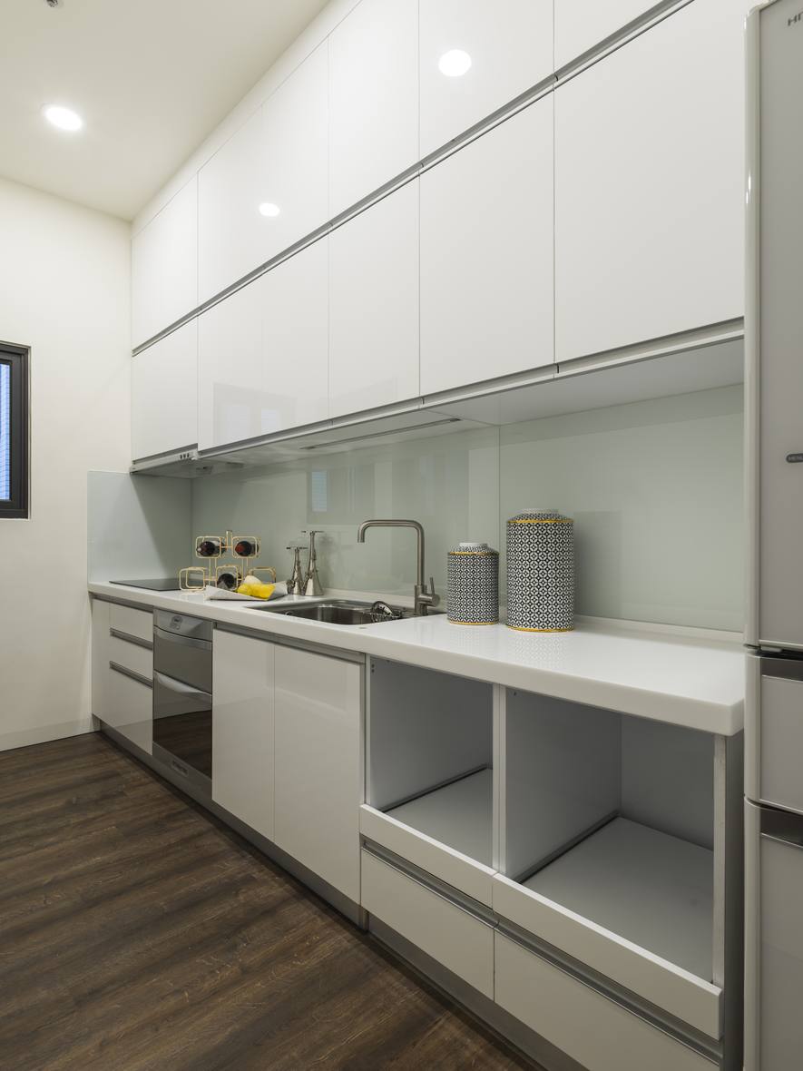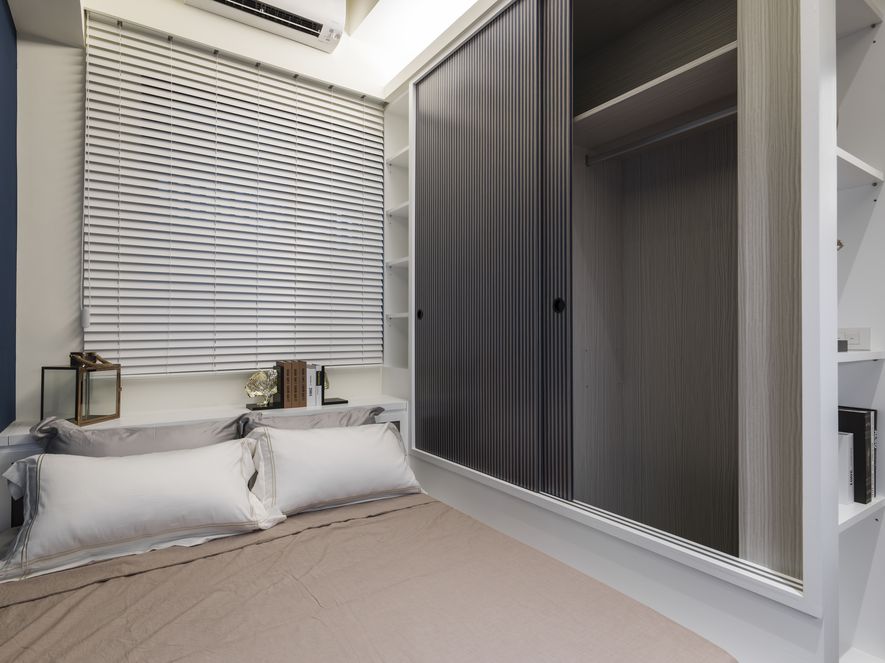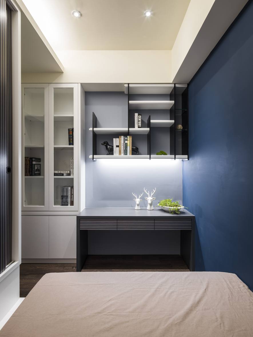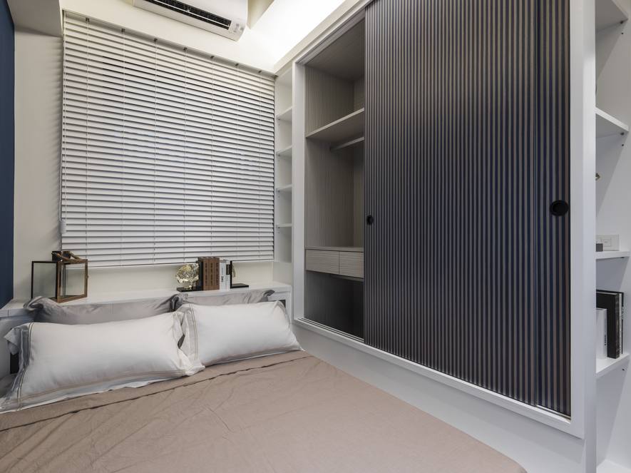 收納櫃的造型門板及白淨色調,讓空間中多了層次變化。