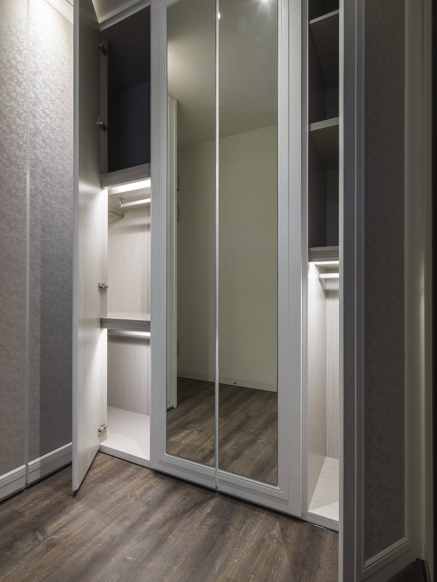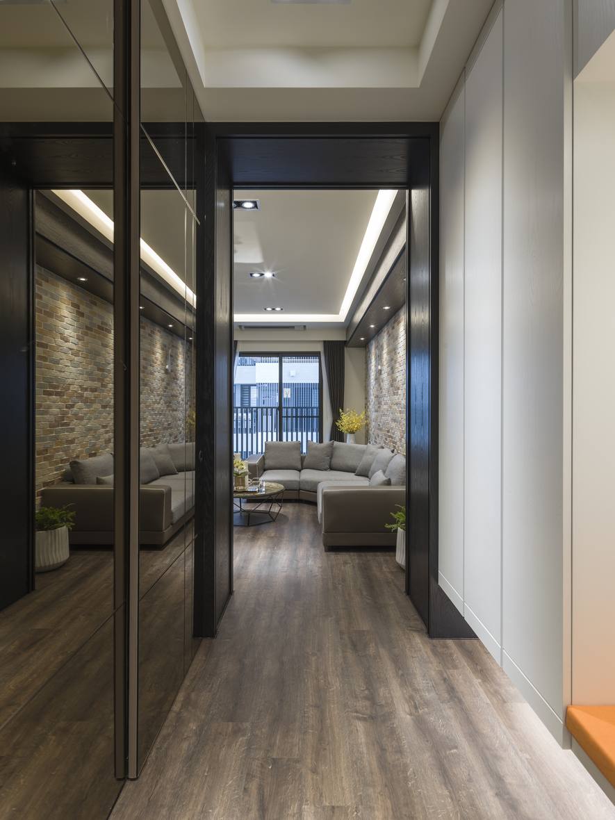 設計師在玄關壁面中,運用大面積的落地鏡面結構,擴大視覺空間。