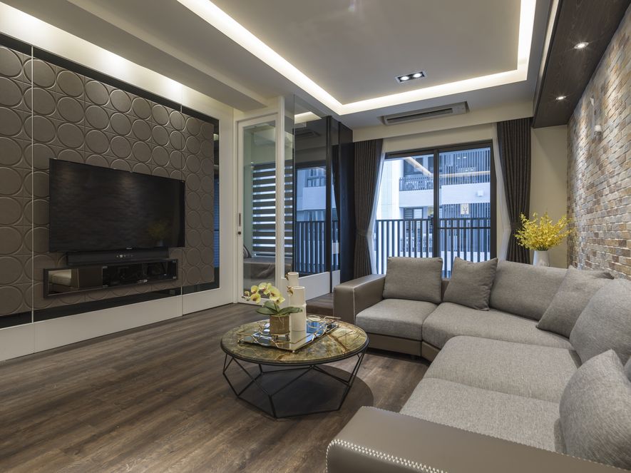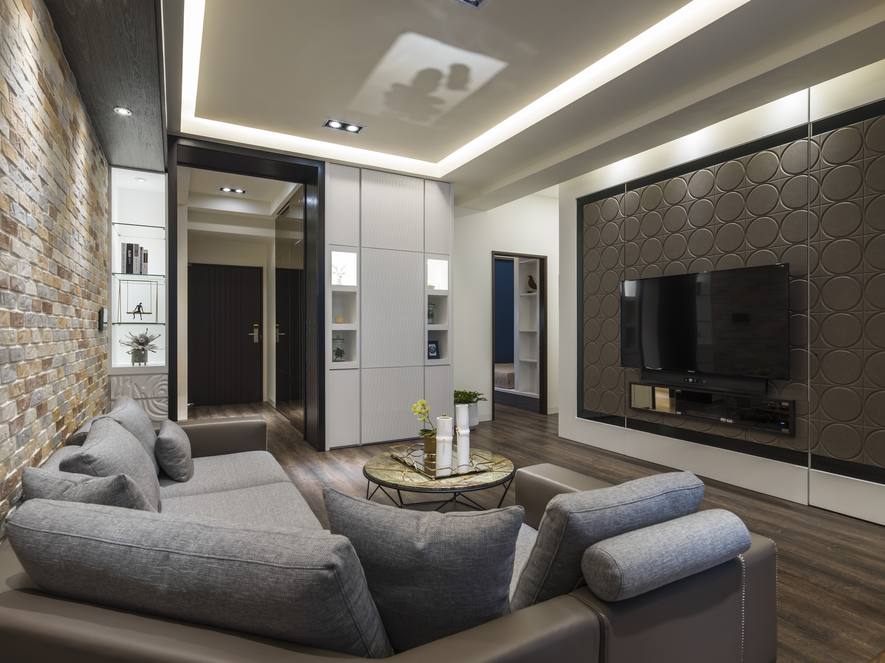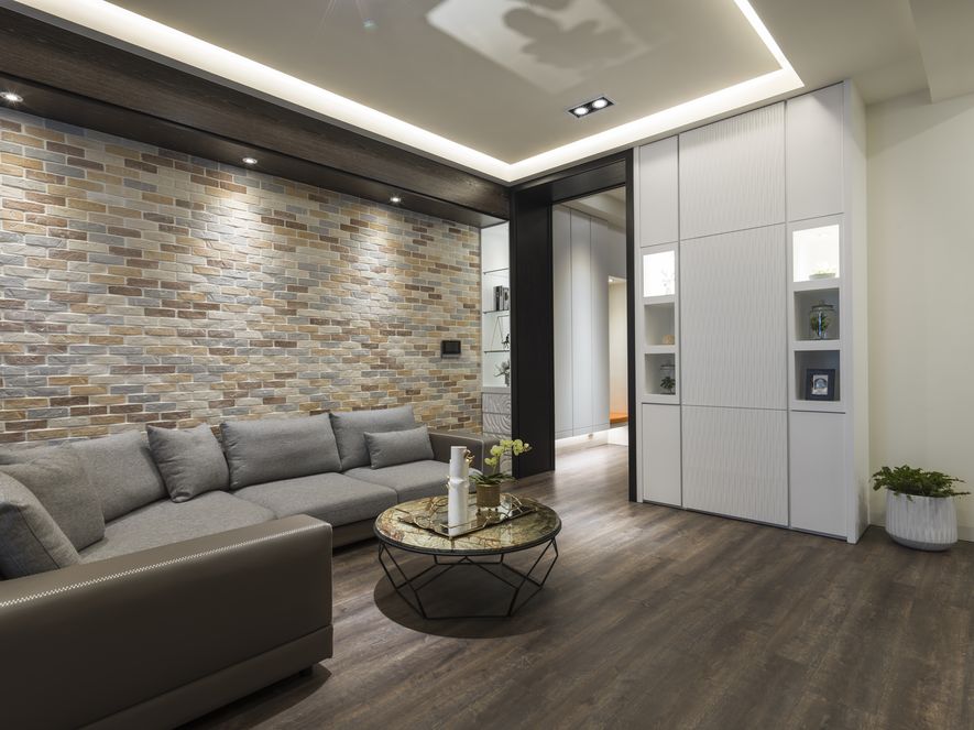 木地板搭配深色木皮與沙發背牆文化石,使空間氛圍顯得溫馨而恬靜。