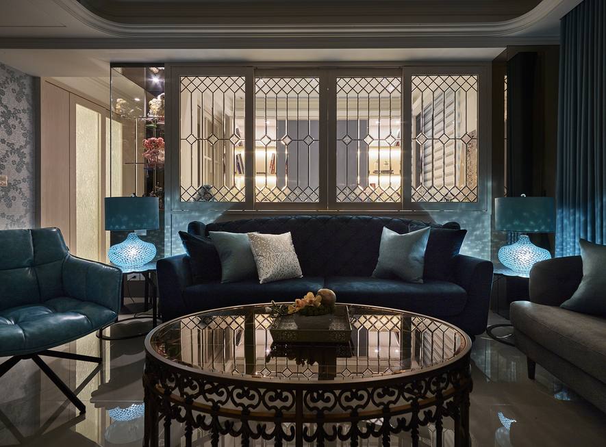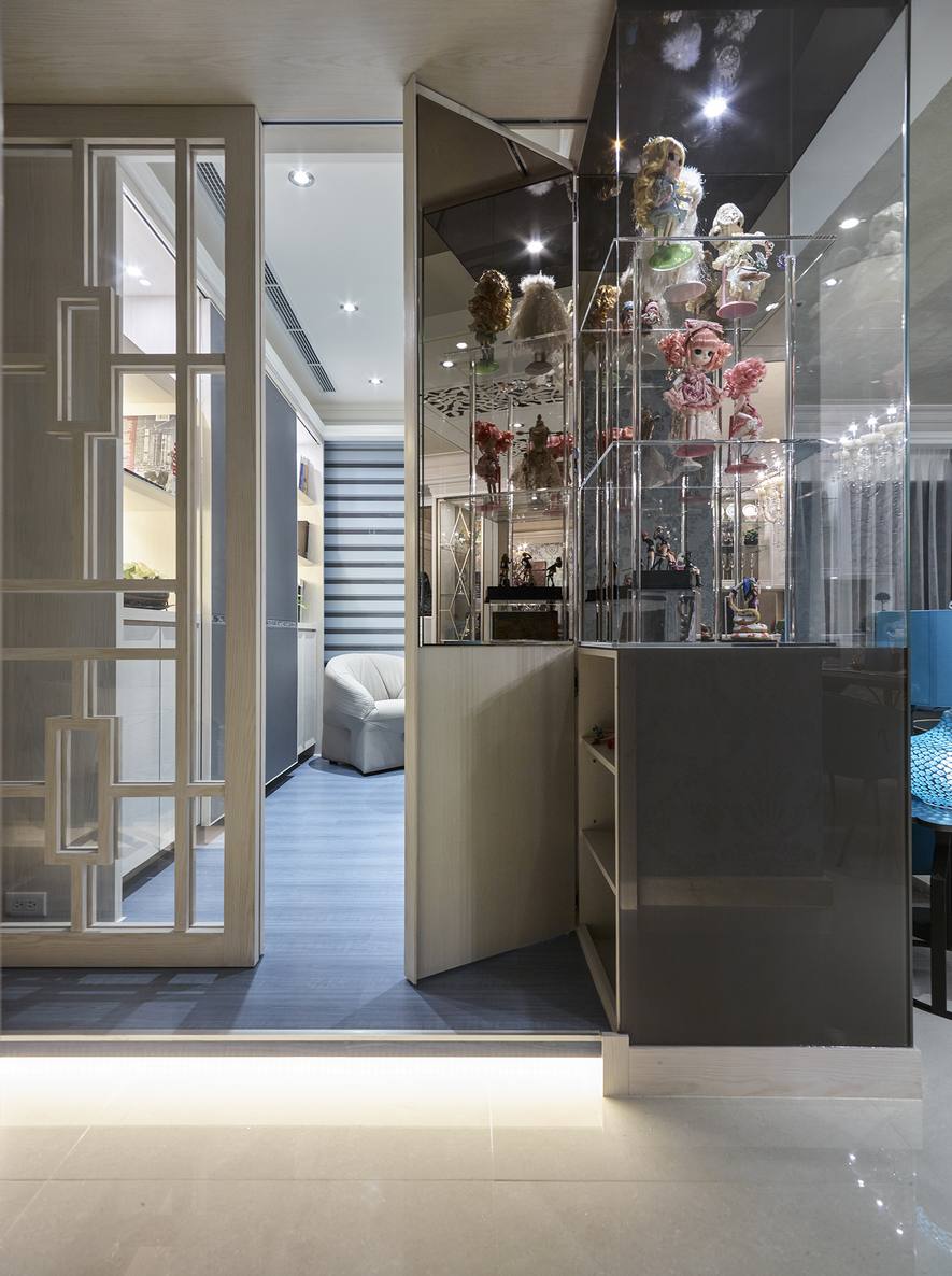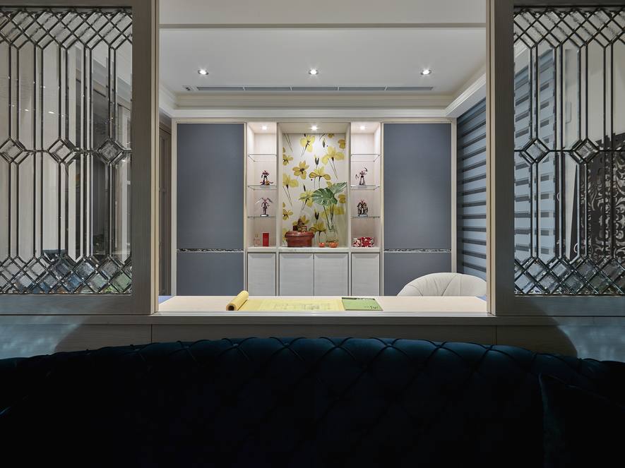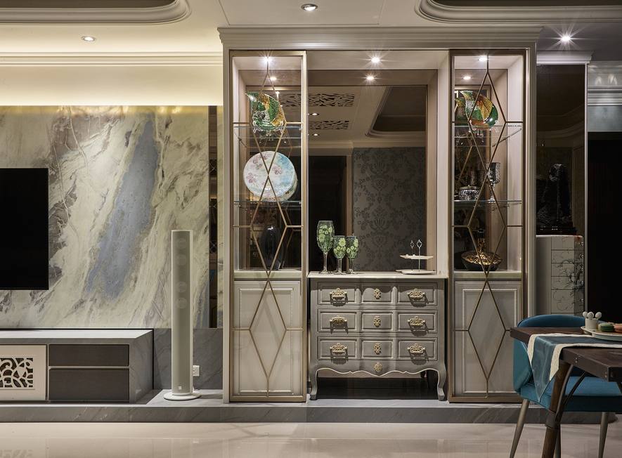藉由異材質的混搭手法,打造宮廷般的唯美空間,包括皮革、石材、貝殼版、壁紙的使用等,衍生豐富的視覺層次及美感。此外,這次亦特別選用不同特性的玻璃,例如書房與客廳的窗扇採鑲嵌玻璃,其立體導角帶有歐式線條語彙,輝映本案所要闡述的宮廷風主題。