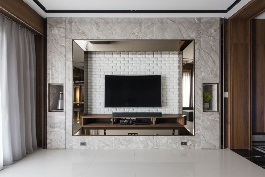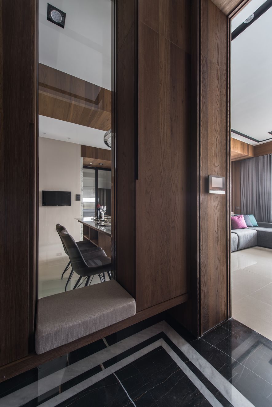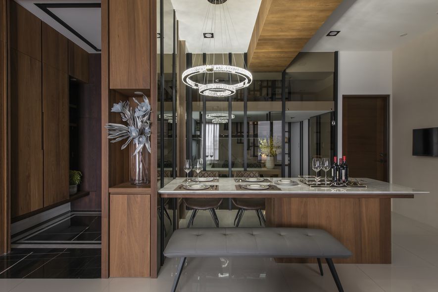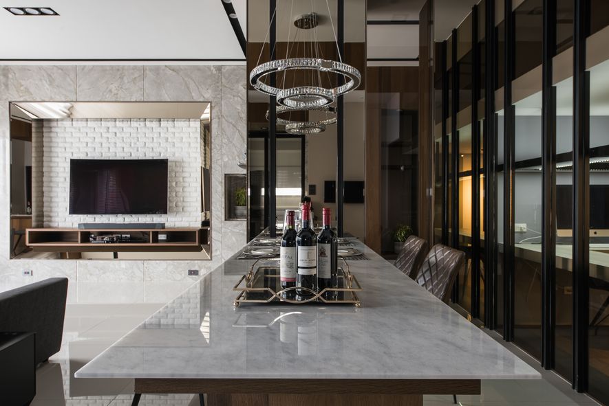 主要建材/ 1.10尺鋼刷實木皮 2.大理石-安格拉珍珠、杜蘭朵、聖羅蘭黑金3.不鏽鋼鍍鈦-咖啡金髮絲紋4.人造石5.烤漆6.波浪紋茶玻璃7.仿石紋抗菌板8.環保調色漆9.LED燈10.進口裱布