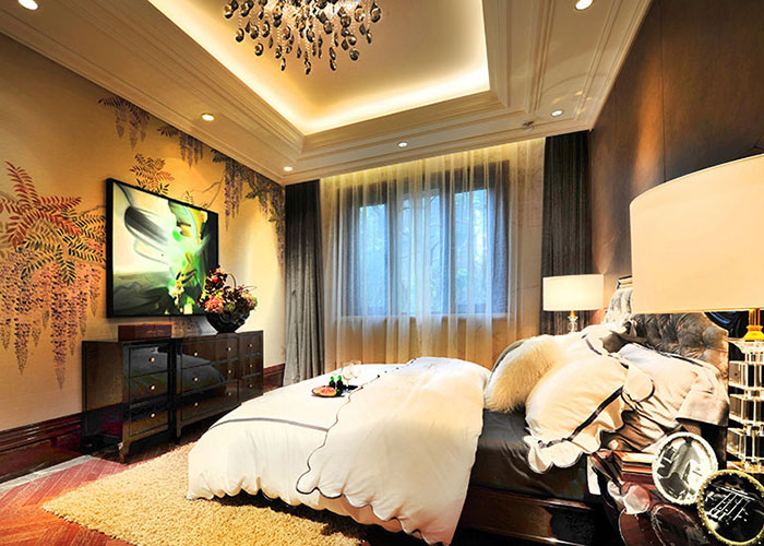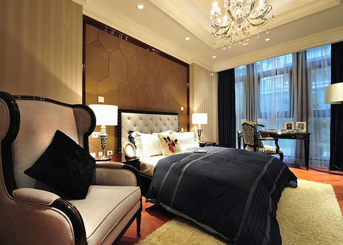 在軟裝搭配上,采取多元素融合的方式,如精織純色床品、富有金屬光澤的擺件、綢鍛靠墊、色彩厚重的歐式單人沙發,通過光線的配合,營造出華美雋永的居室格調。