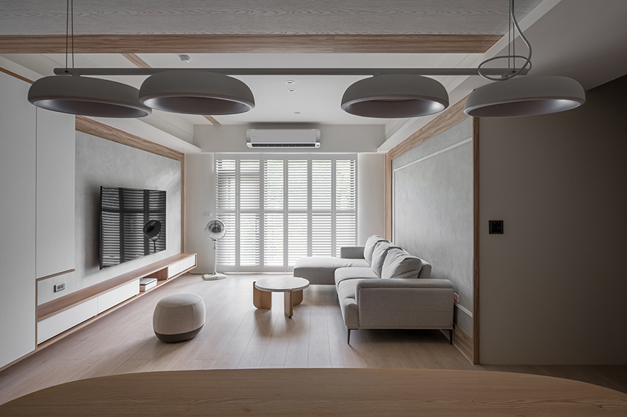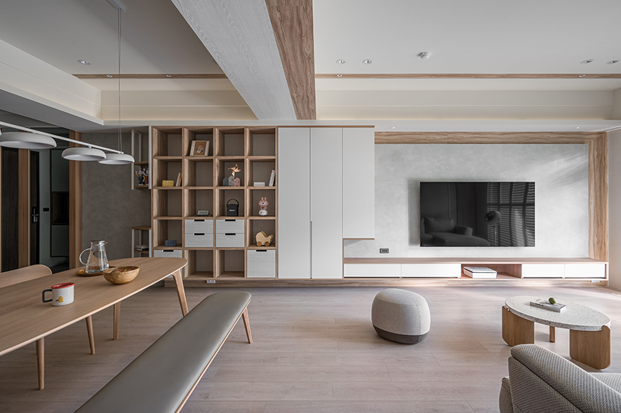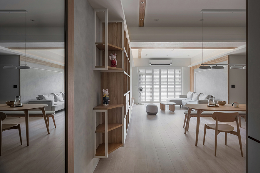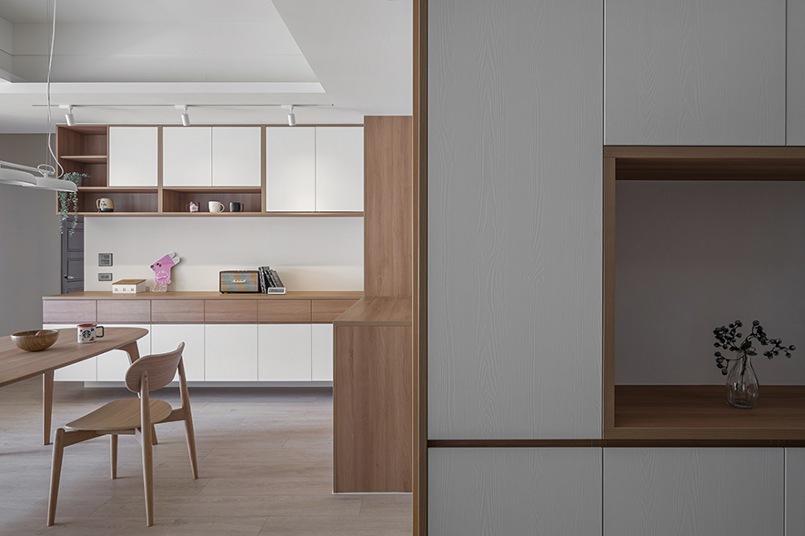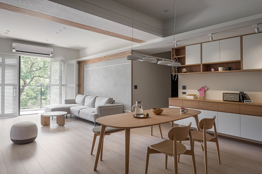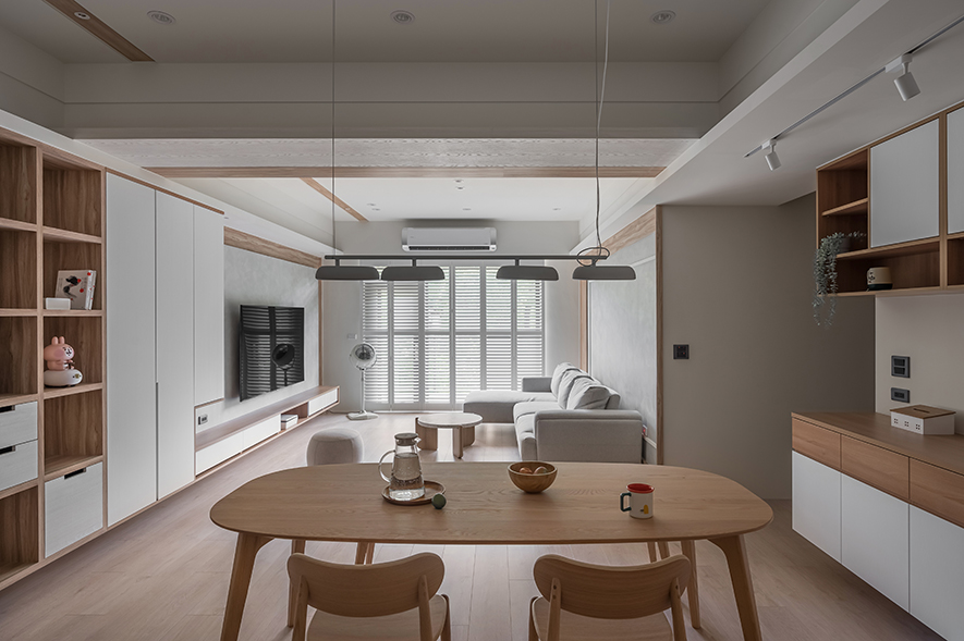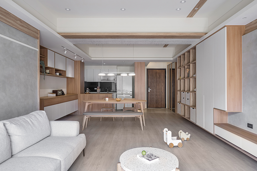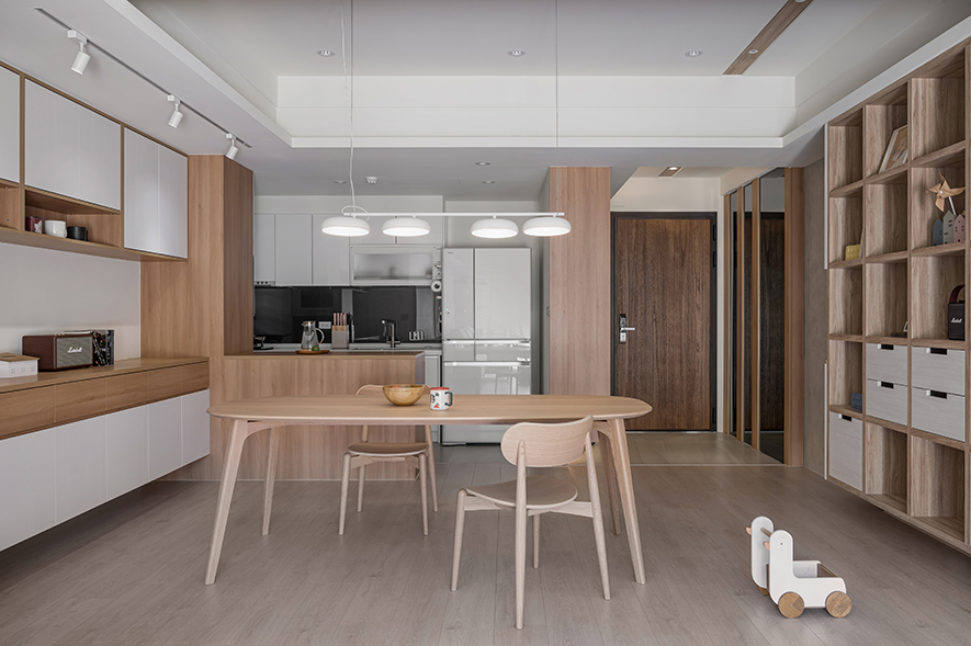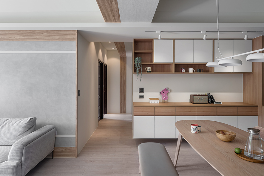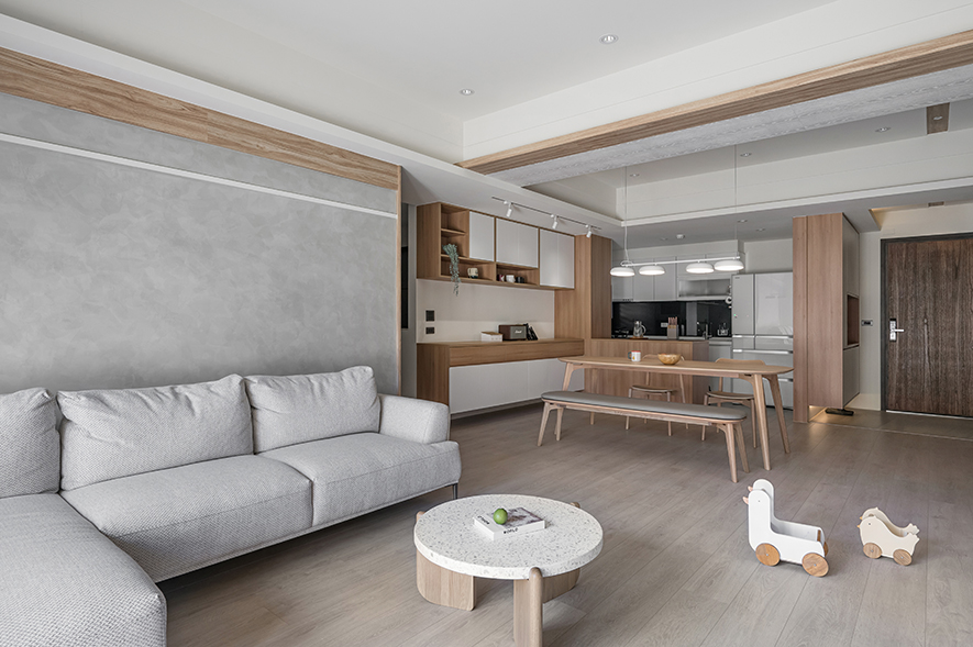 微風輕拂,晨曦溫柔照映,清光灑落一室,清新舒坦的樣貌,形成家的純粹姿態。優雅潔白,交錯以木紋,淺色調的質地,鋪展出和諧輕鬆的親情敘事,沉浸共伴時光於簡約線條勾勒之中。