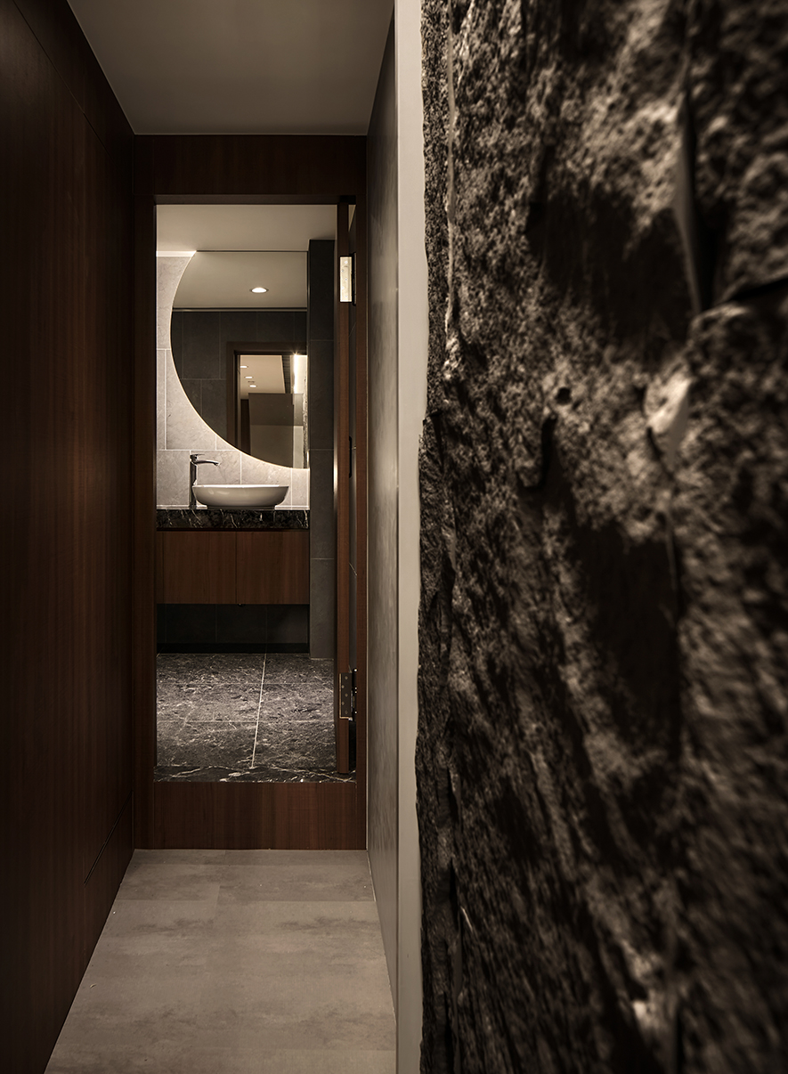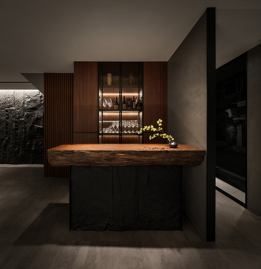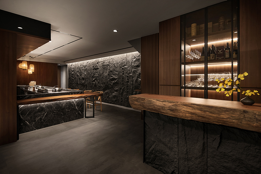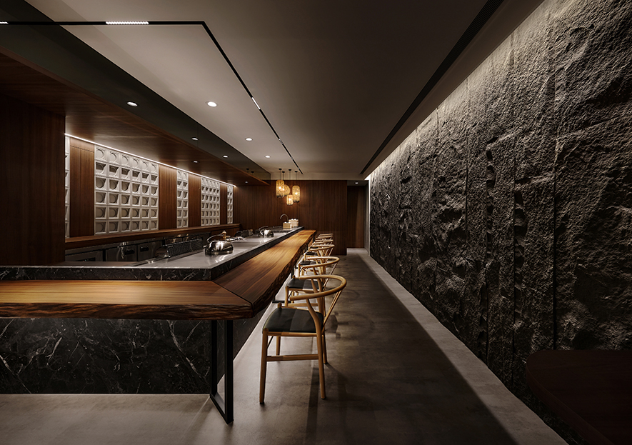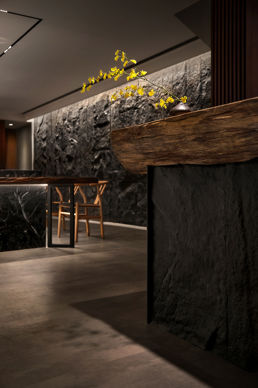融貫象徵餐廳品牌的「巢」與沉穩閑靜的「禪」,我們結合環保材料和生物窩巢周遭的元素,運用石皮、木材與水源構築安寧的饗食空間,期許藉質樸的天然紋理,傳遞自然和人的密切性,同時於門面以現代手法重現古時影壁,搭配後方的轉折廊道,替造訪者隔絕匆促生活中的熙攘,帶來靜心享受美食的恬適。