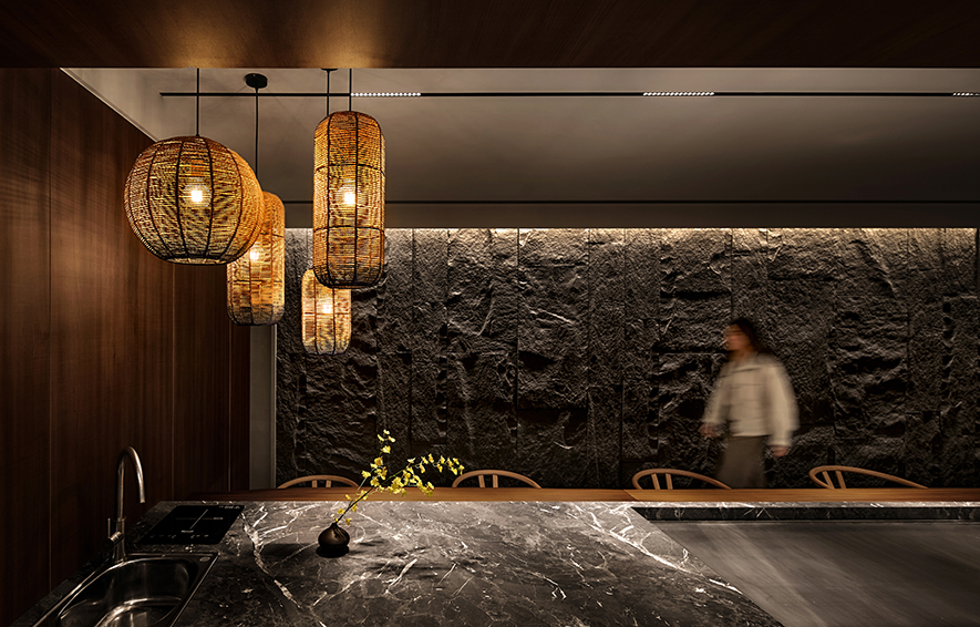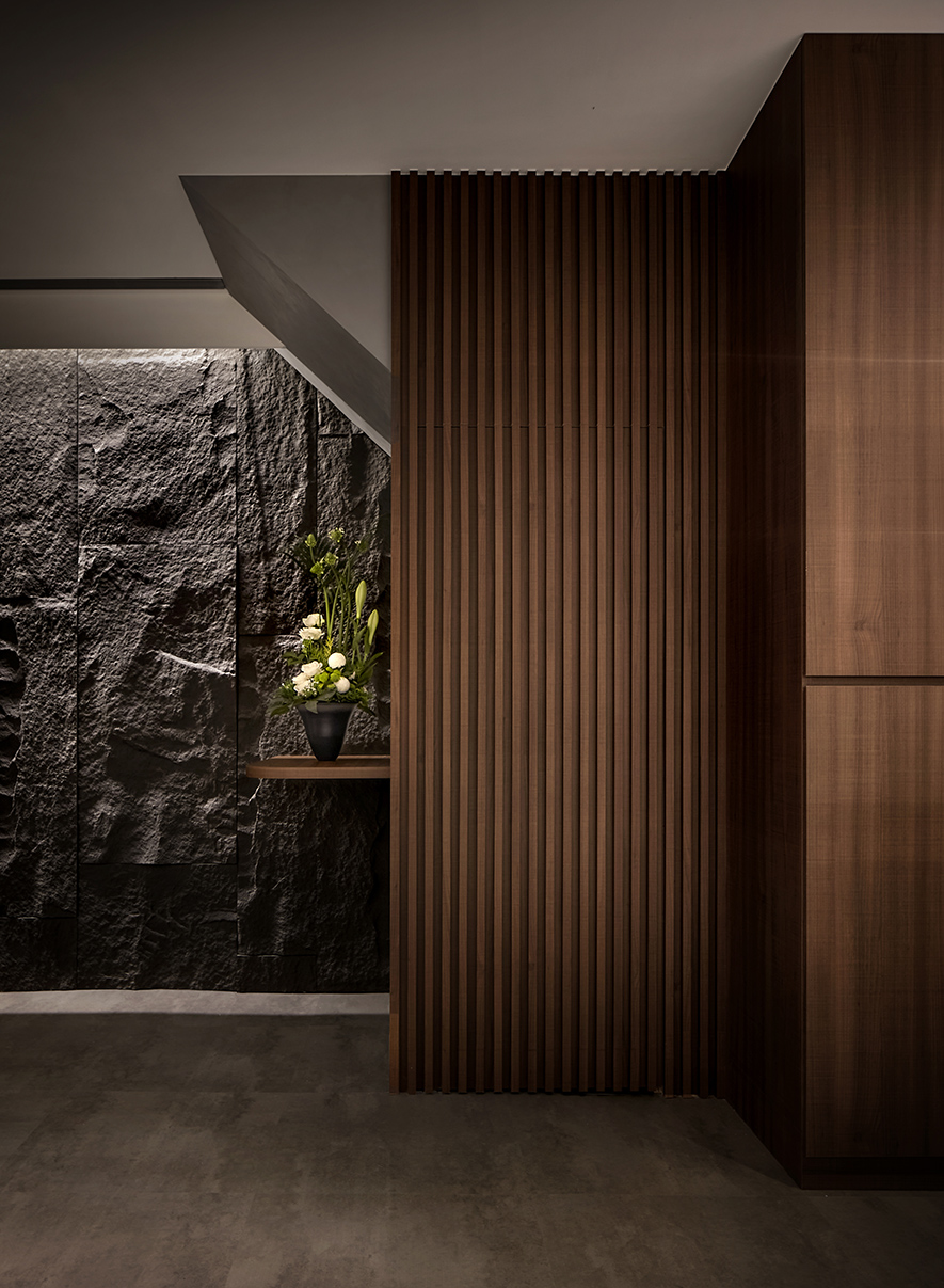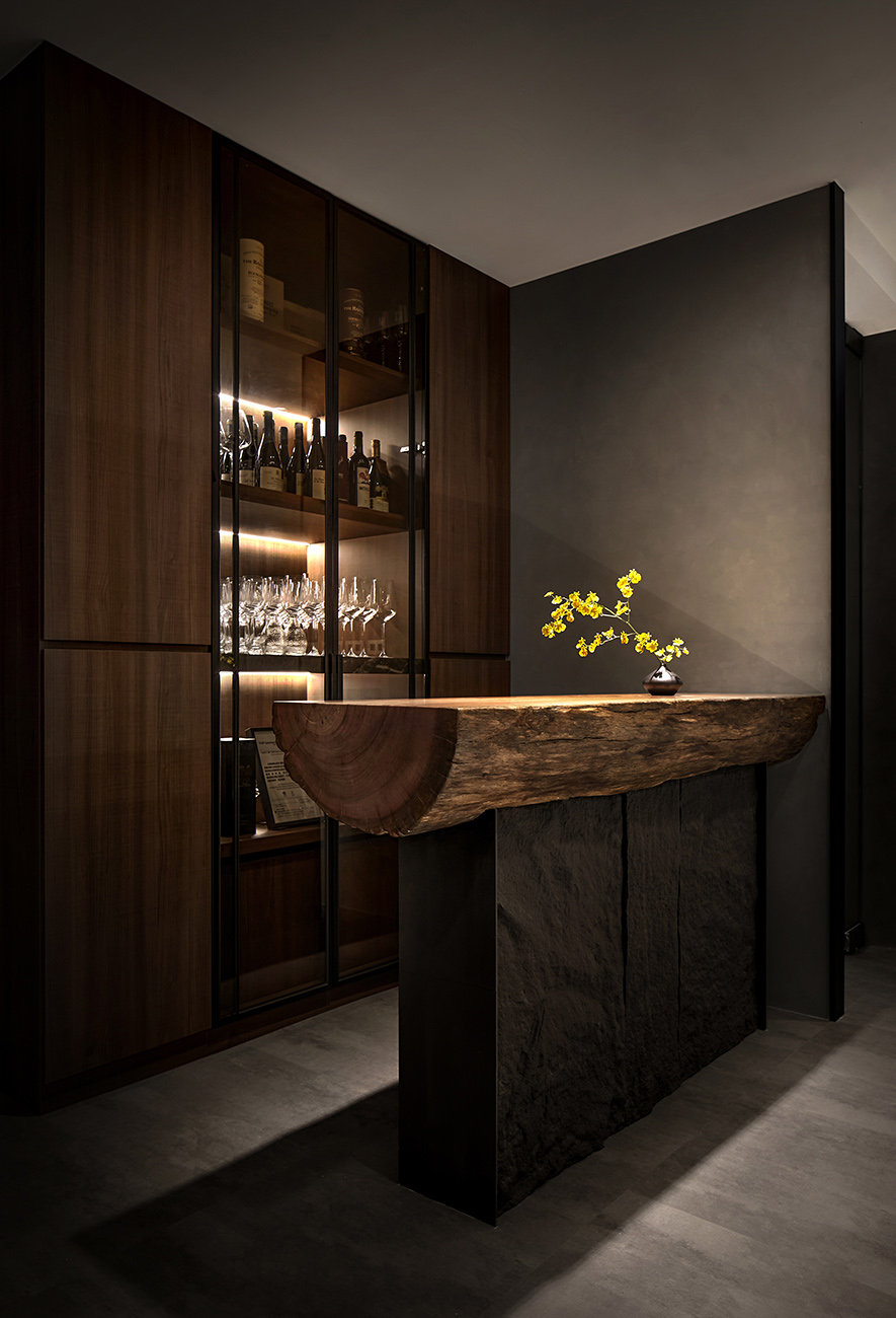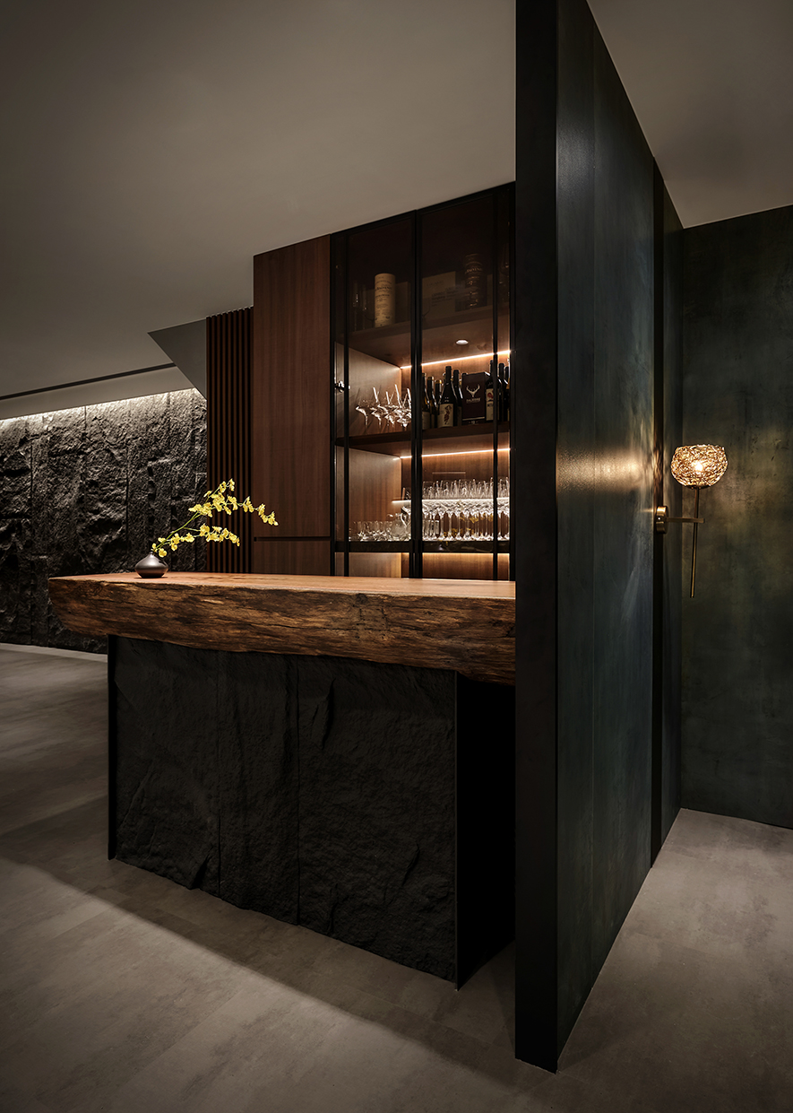 融貫象徵餐廳品牌的「巢」與沉穩閑靜的「禪」,我們結合環保材料和生物窩巢周遭的元素,運用石皮、木材與水源構築安寧的饗食空間,期許藉質樸的天然紋理,傳遞自然和人的密切性,同時於門面以現代手法重現古時影壁,搭配後方的轉折廊道,替造訪者隔絕匆促生活中的熙攘,帶來靜心享受美食的恬適。