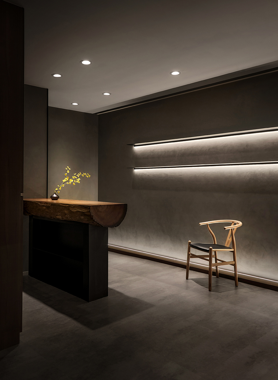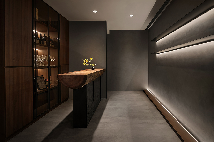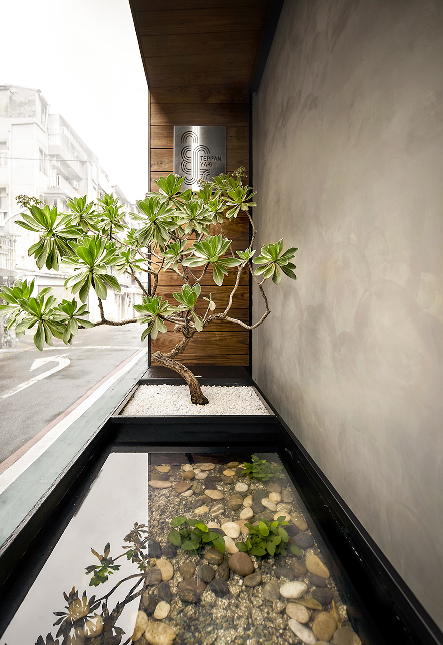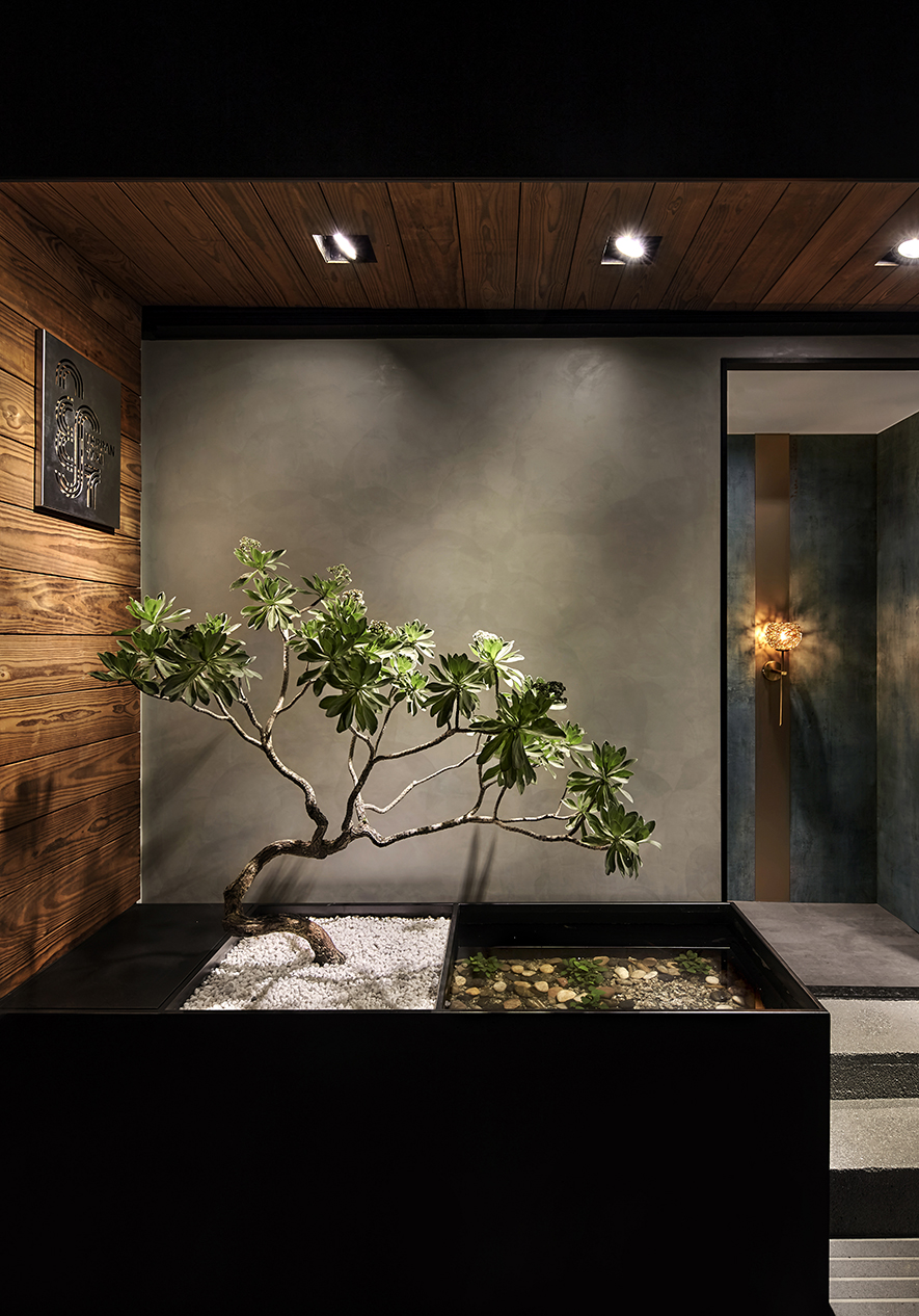 設計理念/ 畫布般的灰白壁面,輕撚妙筆抹開一方微涼池水,勾勒出一株枝芽翠綠的白水木,令一幅禪景悄然躍現於繁忙的都市巷弄中,而深處隱約飄來的佳餚香氣,吸引過客們好奇探尋:「倘若拐過巢型壁燈的轉角,是否真能通往世外桃源?」