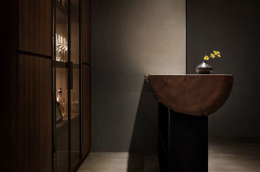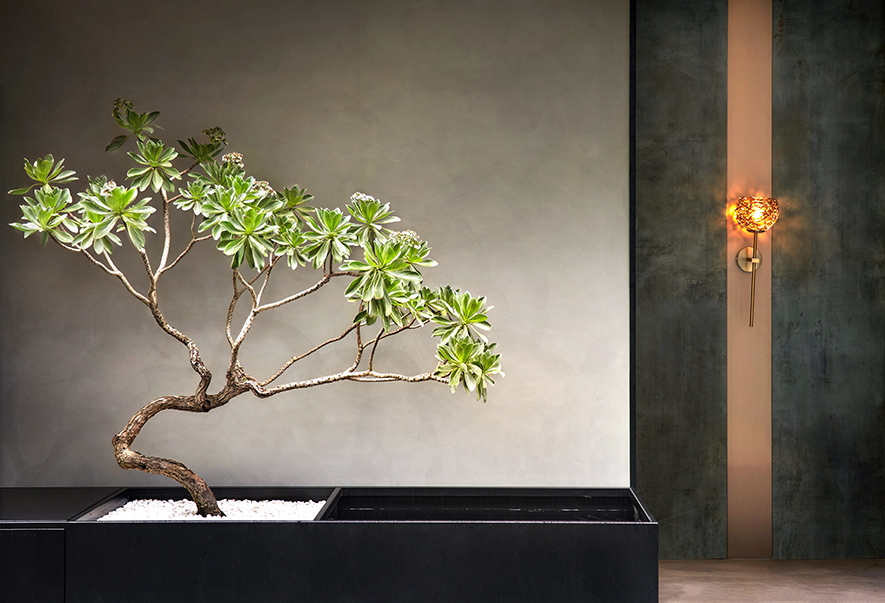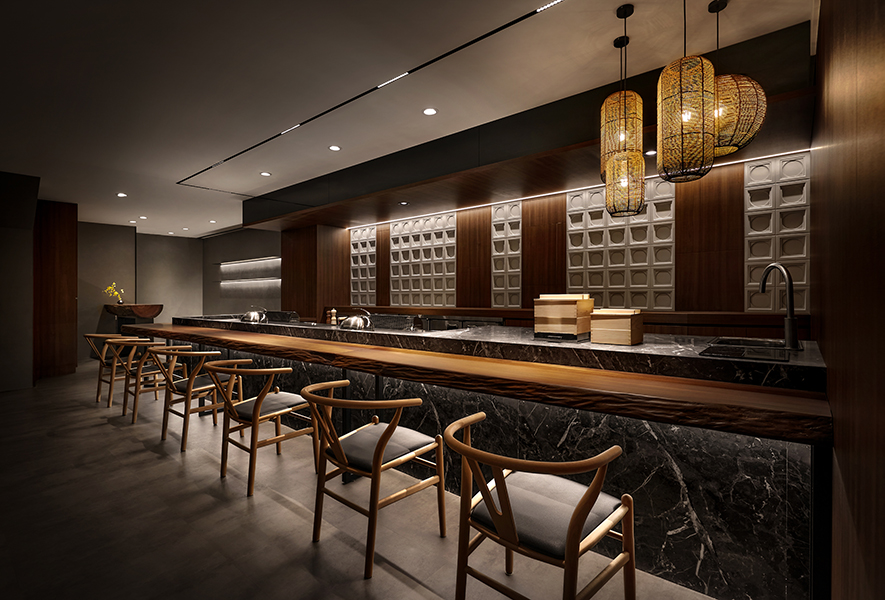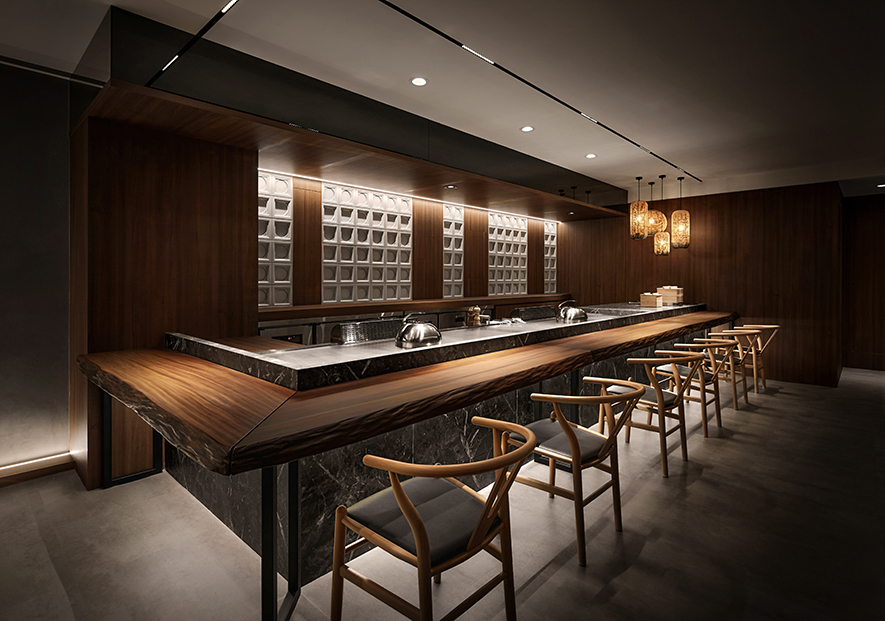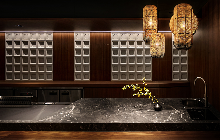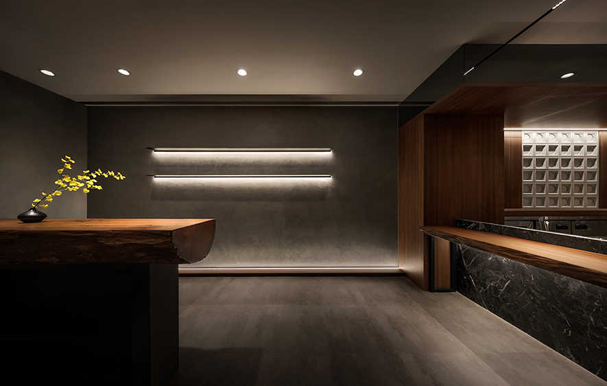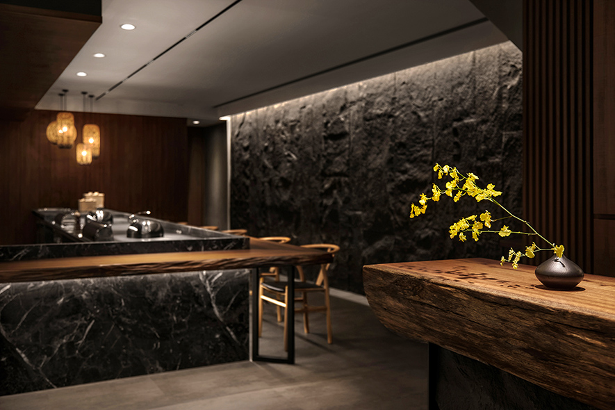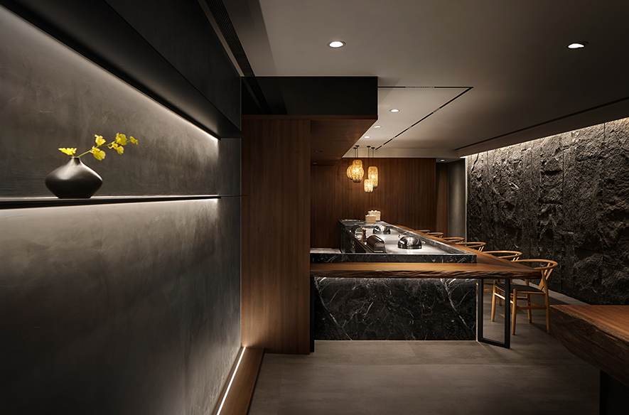 設計理念/ 畫布般的灰白壁面,輕撚妙筆抹開一方微涼池水,勾勒出一株枝芽翠綠的白水木,令一幅禪景悄然躍現於繁忙的都市巷弄中,而深處隱約飄來的佳餚香氣,吸引過客們好奇探尋:「倘若拐過巢型壁燈的轉角,是否真能通往世外桃源?」