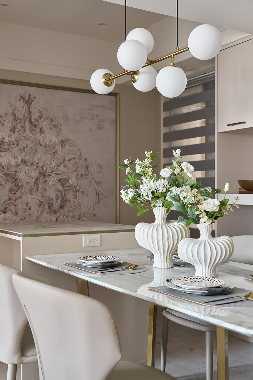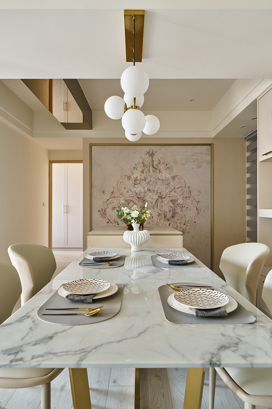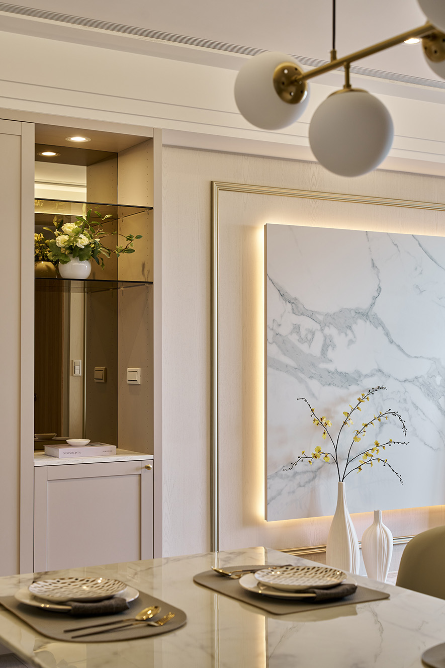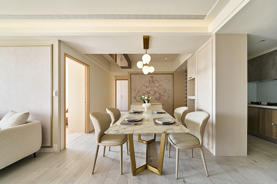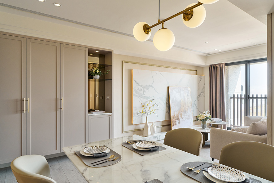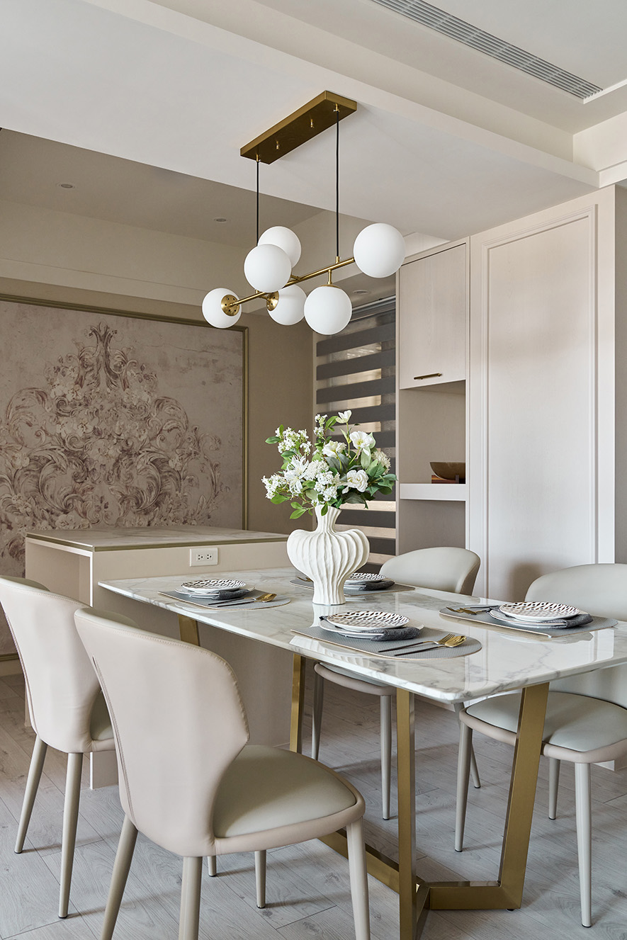 整體風格採新古典設計,運用線板、壁紙與細緻軟裝,營造優雅輕奢氛圍。公領域透過鏡面材質延伸視覺尺度,並適度留白,避免過度填滿,讓空間更顯開闊且保有流動性;收納則整合於中島設計,兼顧機能與動線。