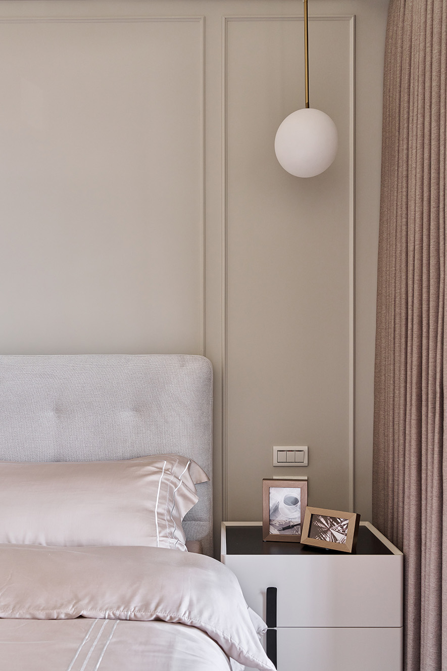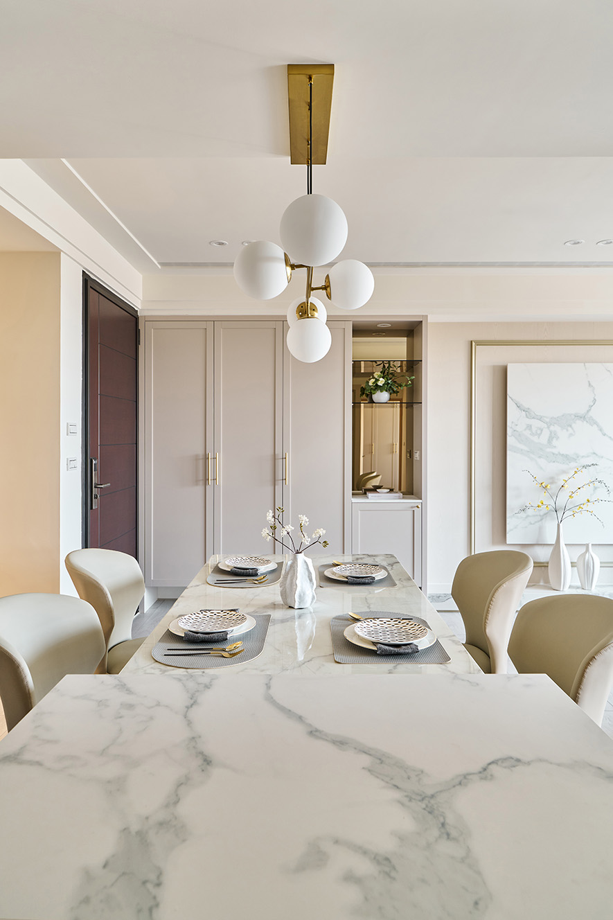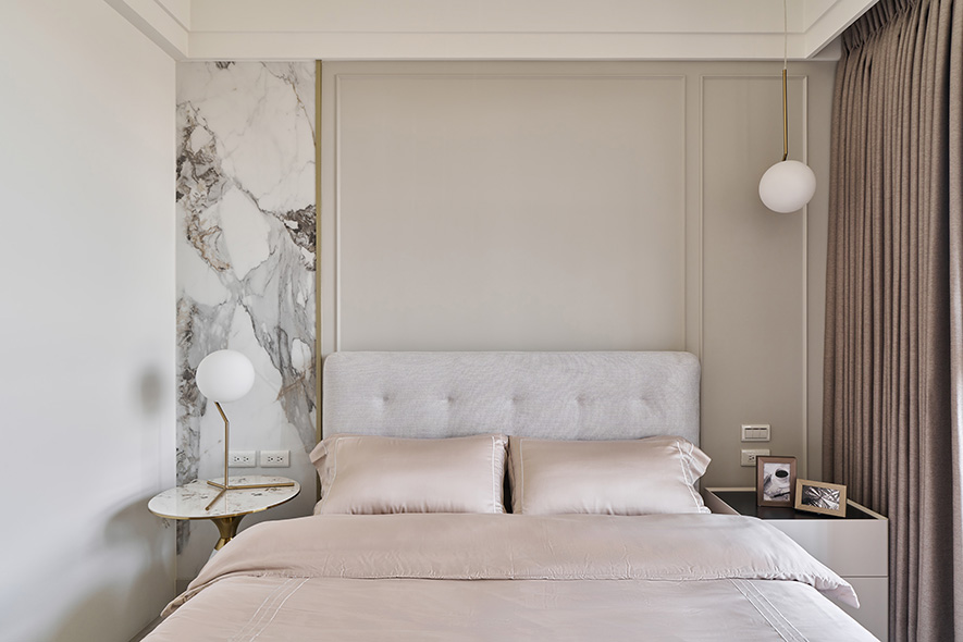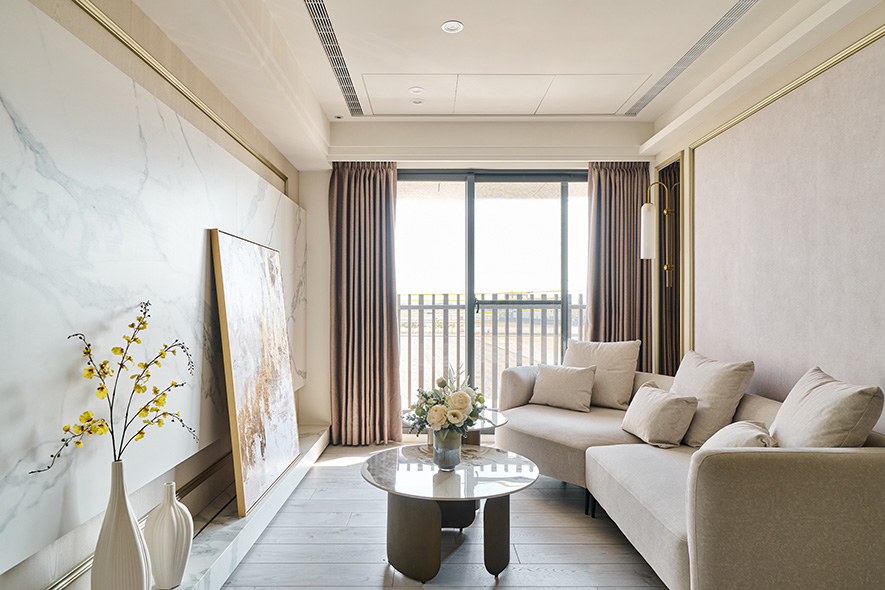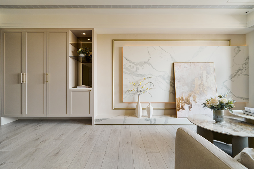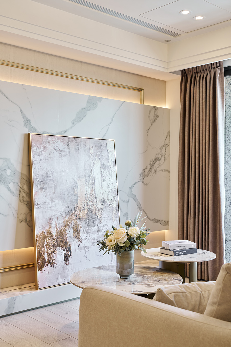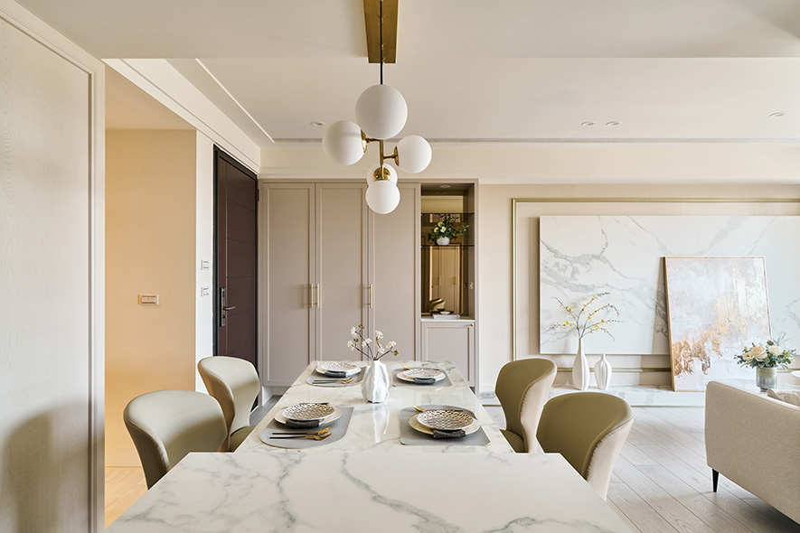 整體風格採新古典設計,運用線板、壁紙與細緻軟裝,營造優雅輕奢氛圍。公領域透過鏡面材質延伸視覺尺度,並適度留白,避免過度填滿,讓空間更顯開闊且保有流動性;收納則整合於中島設計,兼顧機能與動線。