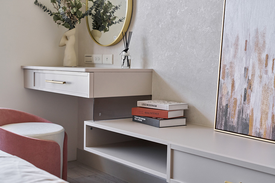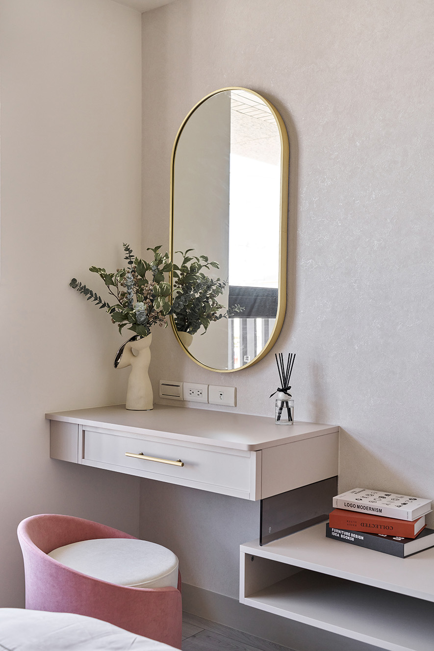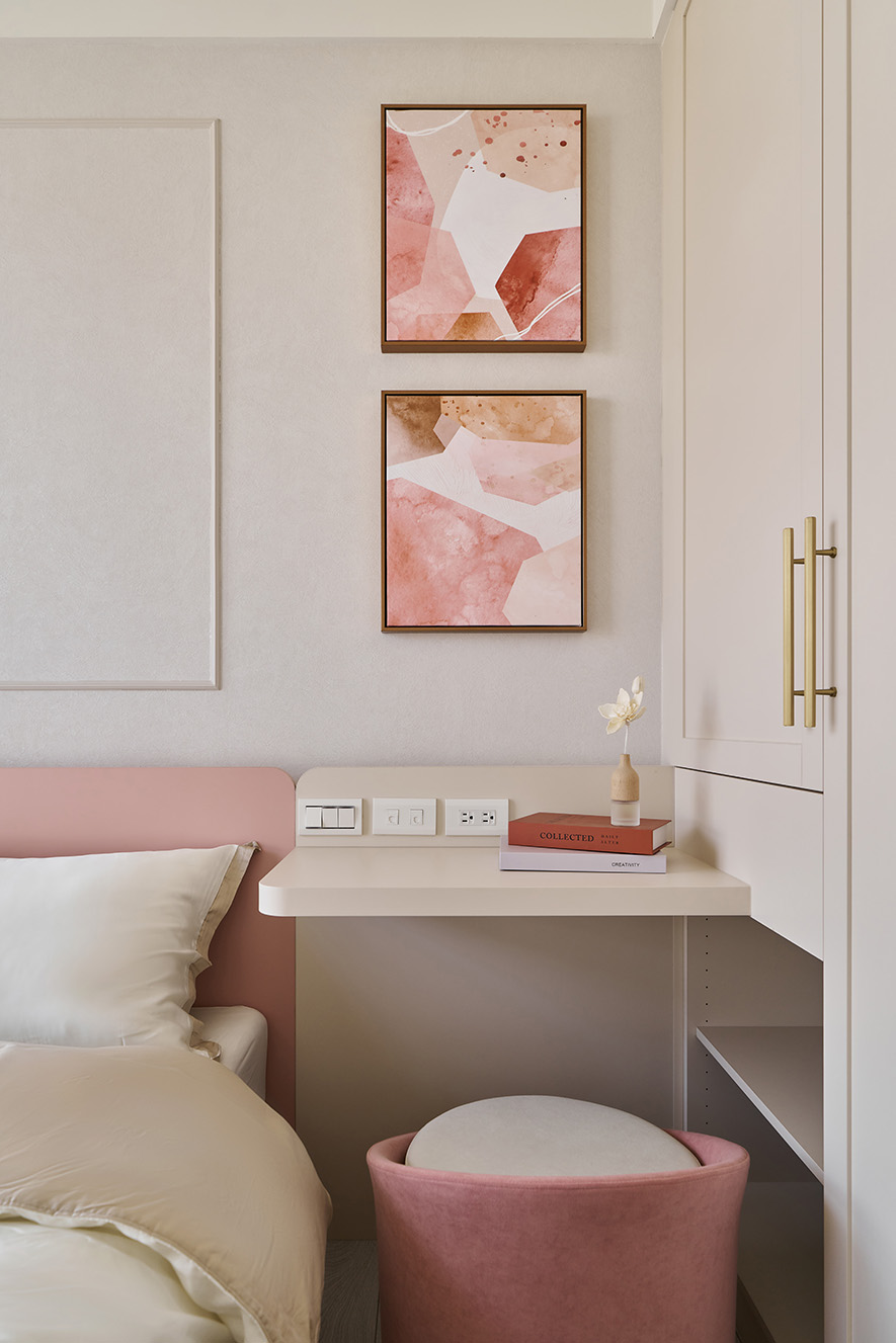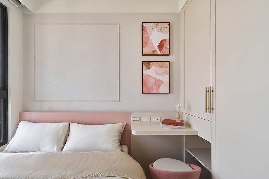 私領域著重色彩的柔和與協調,提升居住放鬆感,並以粉色點綴次臥,增添細膩層次與個性。