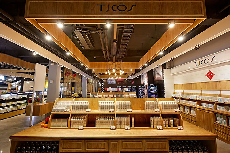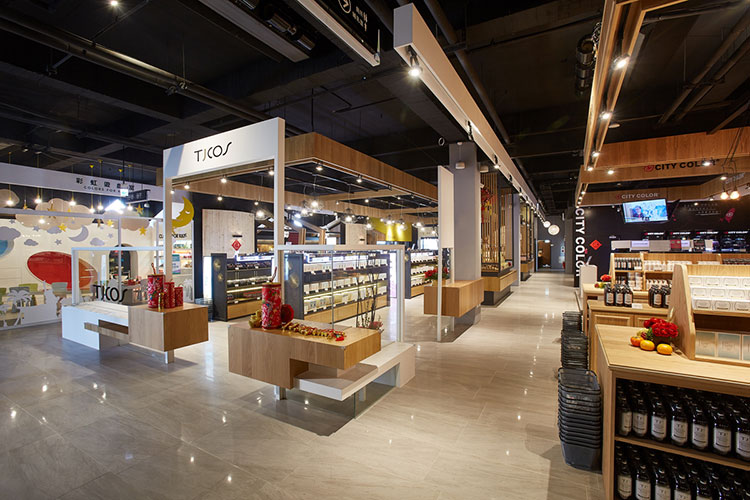 設計師希望呈現美妝綻放的姿態,如同在森林裡齊放的花朵,因此在商品區中只用自然感的木頭為主,而排列在架上的化妝品自然脫穎而出,盛開在空間森林中。
