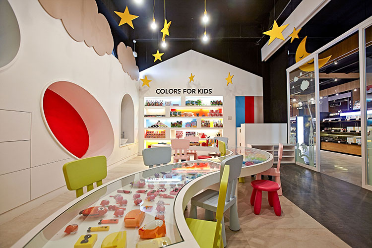 空間格局/ 三層樓,1F:商場、咖啡館、遊戲室,2F:美妝故事館,3F:國際會議廳