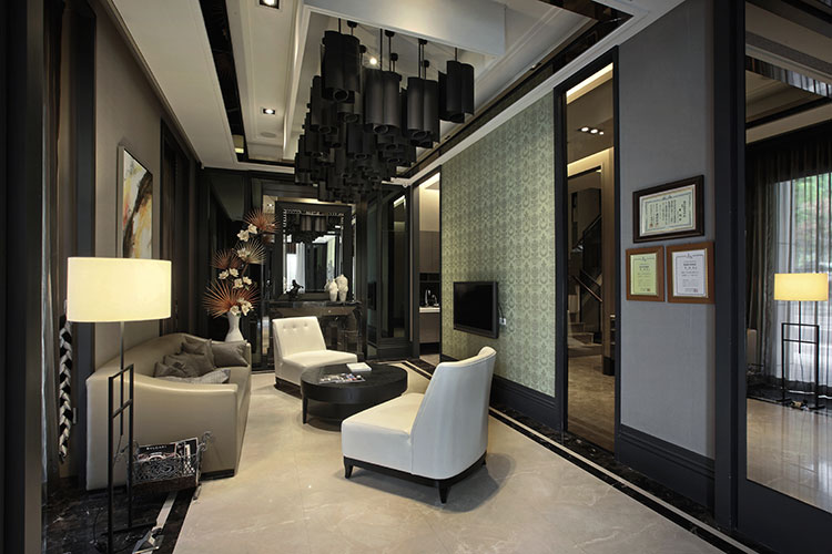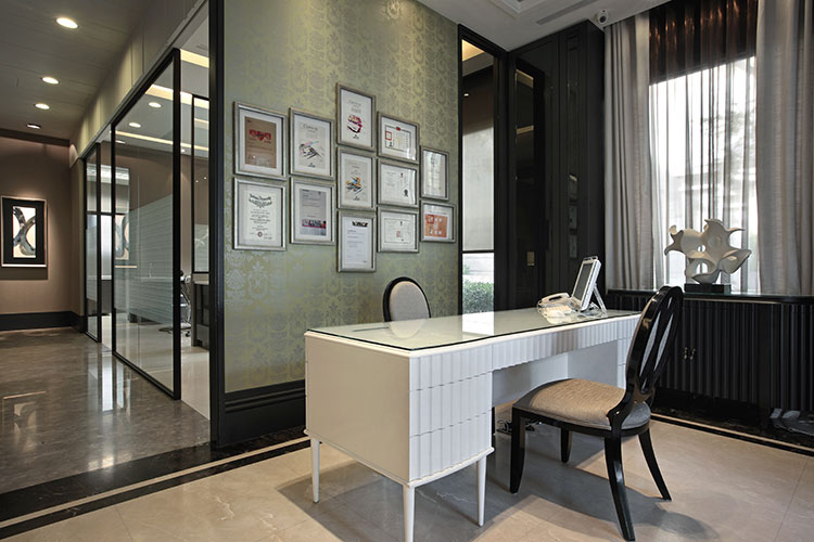 經過如精品擺飾的櫃台,壁紙與傢具的尊貴氣質,引人入室,一樓候診區裡,石材、鏡面、木作等沈穩的用材與色調,營造出放鬆的氣息,以正反雙C勾勒出的線條,揮灑成為最有表情的天花板,而鑄鐵的質感將線條演繹成華麗而低調的圖騰,讓垂降的燈光像朵朵綻放的玫瑰,溫柔籠罩著等候的人們。
