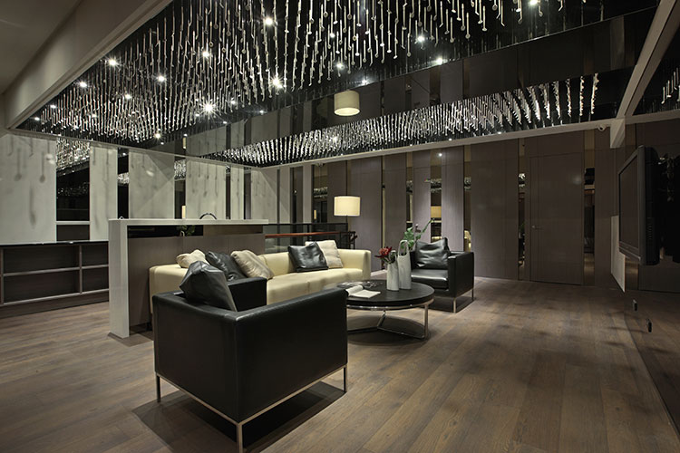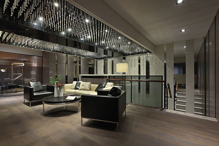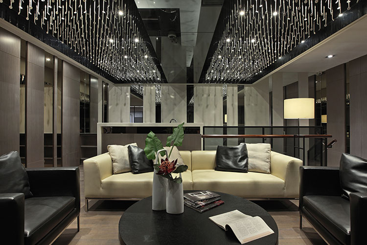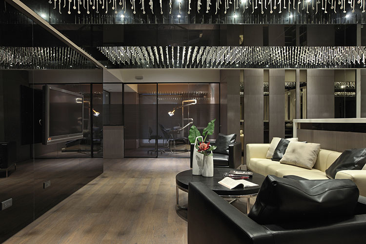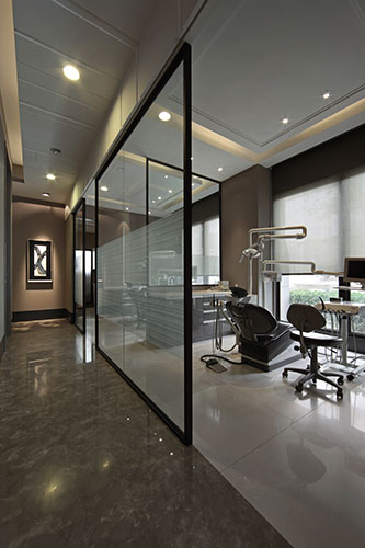 其中一樓接待區,營造出接待會所一般的沙發等待區,以降低接待櫃檯高度,拉近與客戶之間的距離,溫暖優雅的空間既讓看牙醫像在家一般的舒適自在亦如同在尊榮的時尚會館般的被貼心的款待。