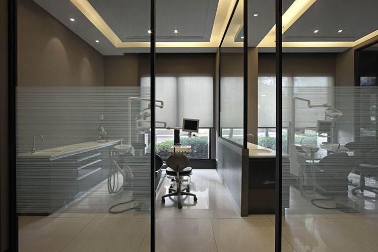 而診療區的部分,將戶外的綠意,透過大面的開窗引進室內之外,廊道自然的光影變化讓空間有了多樣豐富的表情。大量採用半穿透的玻璃與鏡面來圍塑空間,讓綠意與天光能自在的流竄在每個空間中,更將診療室都朝向綠意,輕柔的樂音在空間飄盪,看診彷彿是一趟藝術之旅般的自在愉悅。