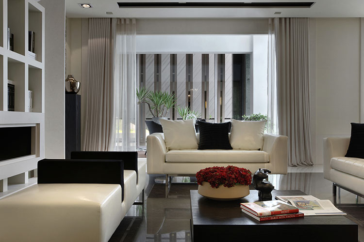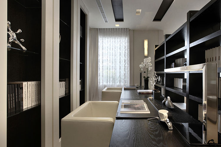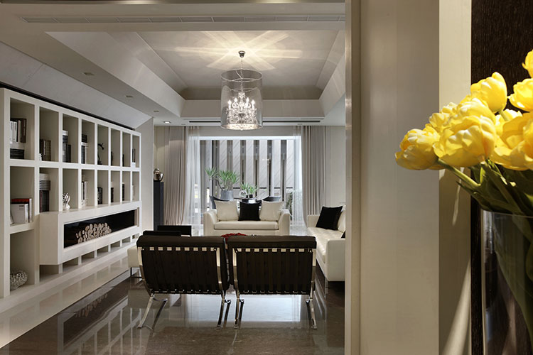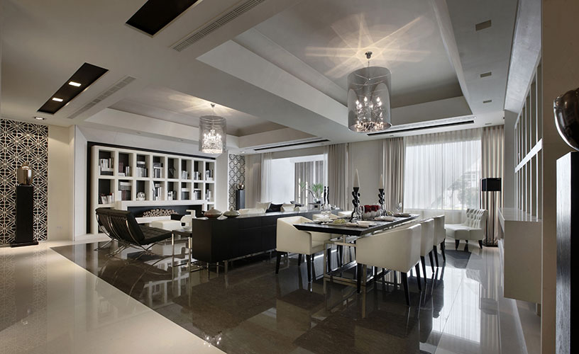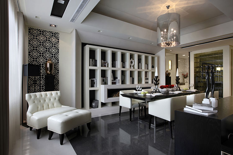 客餐廳以低彩、低限的元素–兩面對稱的大書牆櫃內嵌壁爐,作為微型分隔空間的手法,周圍環繞著是白牆體上保留著木頭的肌理刻紋,及砂岩質地的石材如細嫩肌膚的觸感,有著女性柔美意象的義式傢俱呼應著古典線條的吊燈,如裙襬搖曳生姿的絲綢窗簾、畫作、雕塑與厚實的書本此起彼落,輕聲敘訴屋內的故事,每一天,日夜位移的光影,也成了忠實、靜默傾聽者。