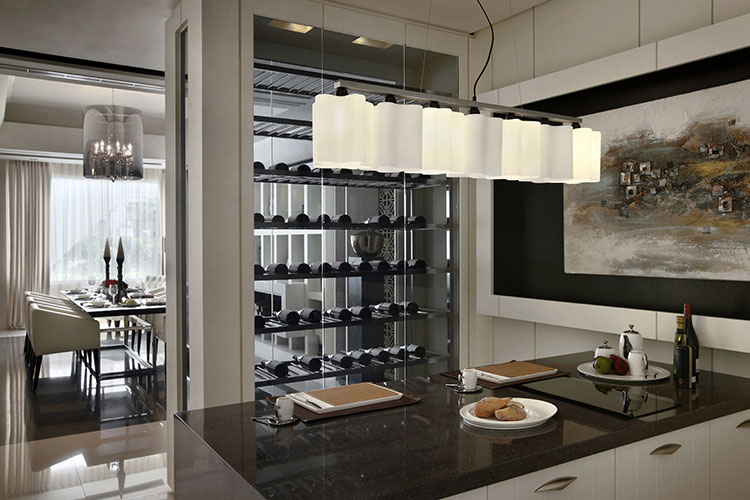 只藉著傢具定義空間用途,可以共享開放、大器的空間氣度;客餐廳間隔著光瑩剔透酒櫃的吧台區,酒櫃作為端景以其透明性聚集了來自四面的光影作為個人品酒、宴客會友的另一場域,隱蔽與開闊並存的意涵,也擴展了空間的多元性格。