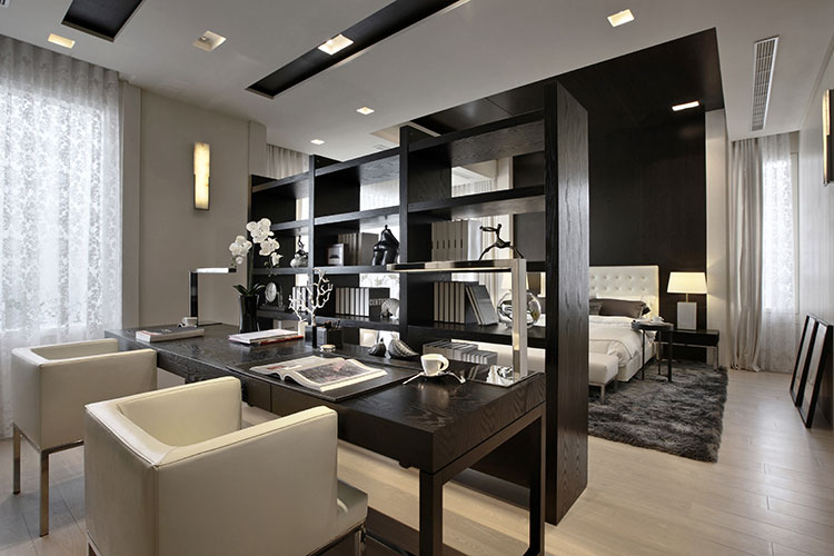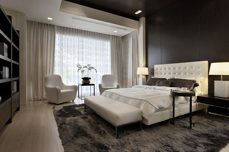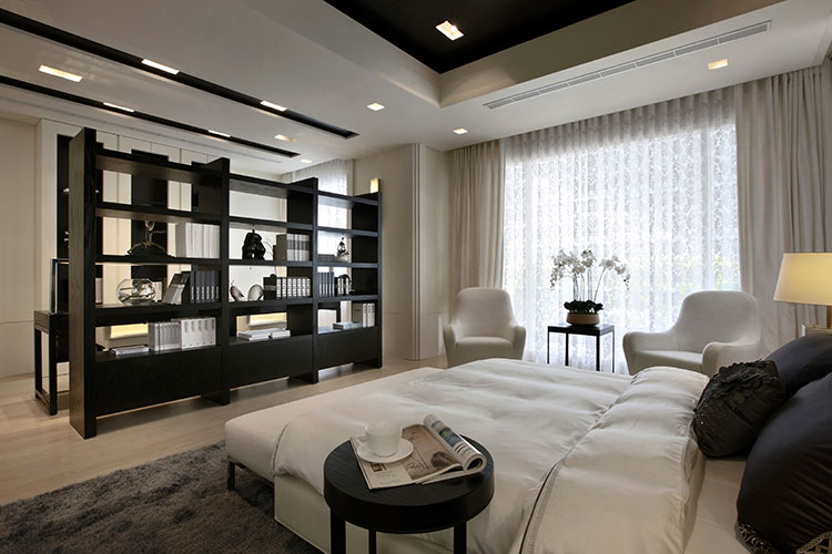 主臥以鏤空書櫃作為分隔休憩與工作的場所,潔淨簡單的線條色彩基調依然貫穿入內,對外窗的自然汲光,讓靜白空間予以沈澱、低語,彷彿光與色的聯袂,是吸納所有聲音與擾動,同時也反芻、吐露出安靜氣息的精靈。