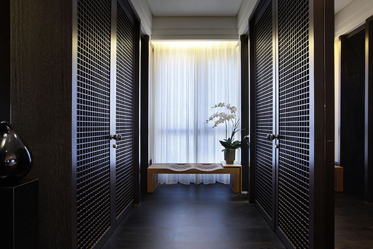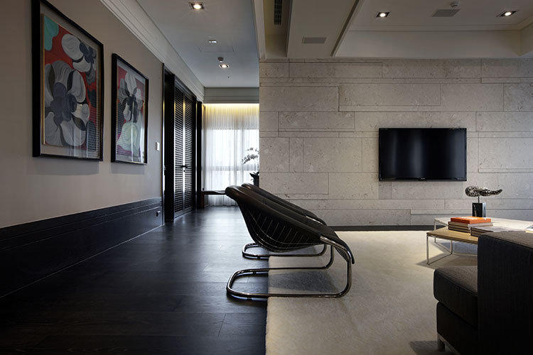 客廳主牆以珍珠萊姆石材不規則的分割,讓仿古面與亮澤面互為交替光線的招引,第一視點在落地玻璃前,將客廳輝映成明亮的祥靜之場,橄欖綠色窗簾與白紗平行於牆面內嵌櫃體而呈一直線,軟硬間隔的擺置,越過客廳,端景是兩廂深色木格柵門夾促而成的落地玻璃窗,木作中間為凹的椅面,揭示這裡是轉入另一個空間的停歇點。