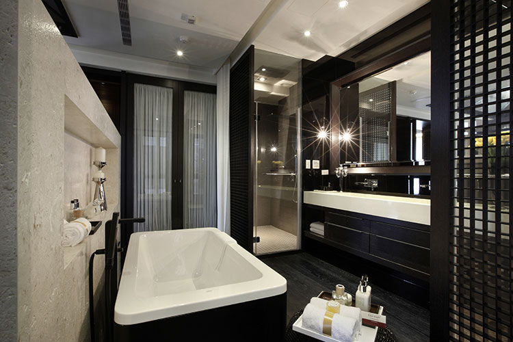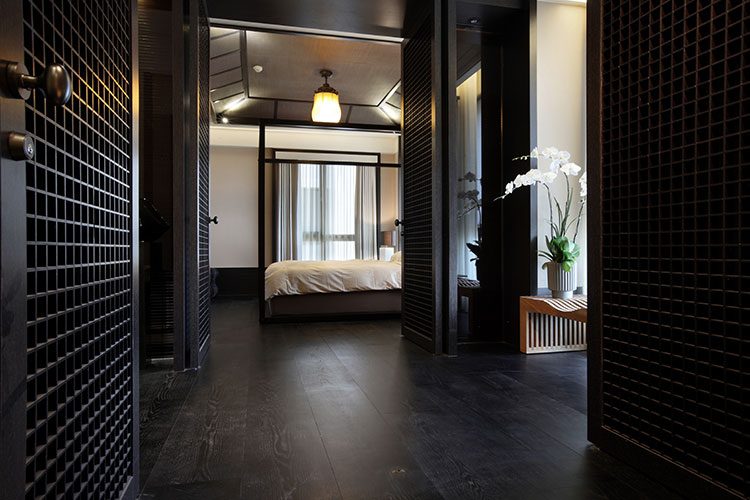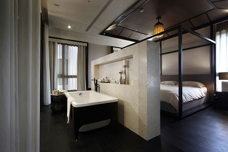 天花以斜面細木作框架而起,並以編織的亞麻布壓貼於上,搭配開闔如花的橘黃色燈飾,為深色木作四柱床增添活潑的色調,牆面以高低板處理,讓整體空間有拉寬的效果浴缸置於電視牆旁,前面則是洗手檯面,由此對稱設計出了兩個半敞開的如廁如沐空間,門外的深色木格柵,在此亦成為了穩定空間又具通透性的介質,協以布幔的運用,讓衛浴空間有了暖意溫色與浪漫意象。
