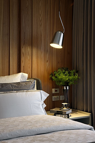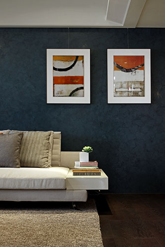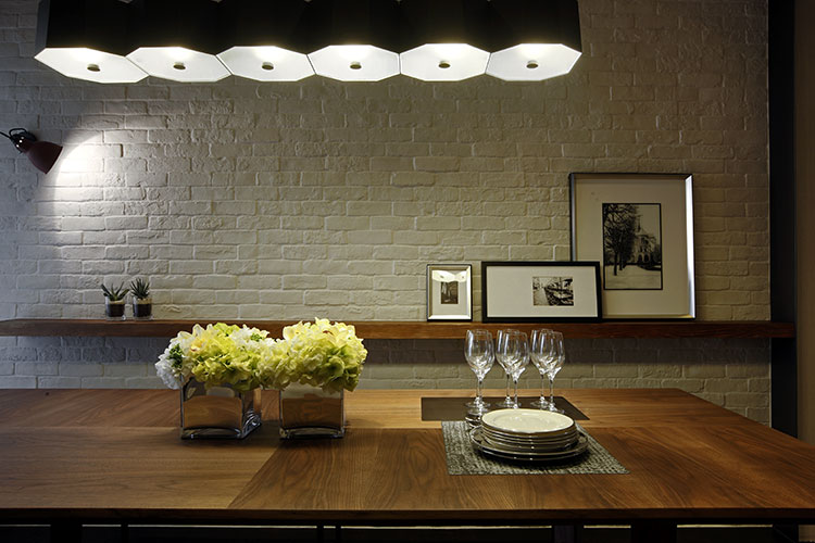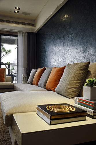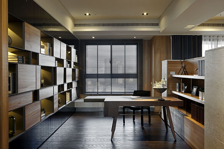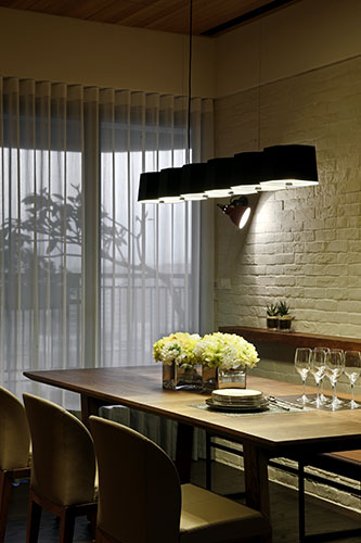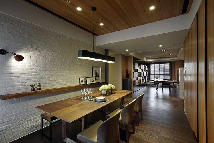 以墨藍綠色馬來漆鋪設主牆營造出如玉石般既具紋理卻又極度光滑的視覺效果,電視櫃則以萊姆石的溫潤質地揉以壁爐設計概念,創造出雙面功能,進而對應另一側書房所衍生的木紋氣質。此外,書房內不規則展示書櫃額透過設計的巧思運用貼黑鏡條的分割創造收納與抽屜並存的活潑意象,尤其是書房臨窗的臥踏,屋主在此可坐可臥、可閱讀、聽音樂、品茶,是休閒放鬆的絕佳位置。對應水平方向的餐廳,設計師以白色彷石磚牆結合戶外樹影流動的自然光景,營造出多功能餐廳的溫馨氣息,且客用衛浴亦以木皮做為掩飾隱藏在暗門之後,體現實用與美觀並存的特性。