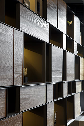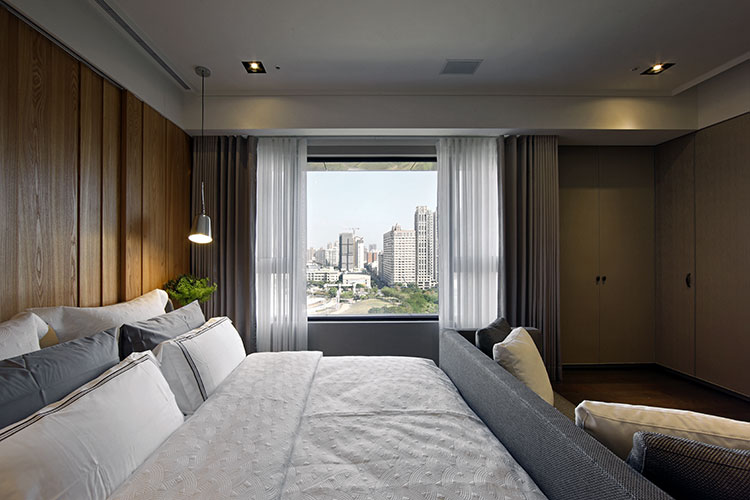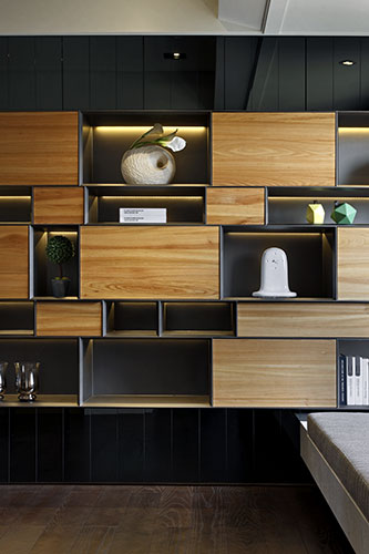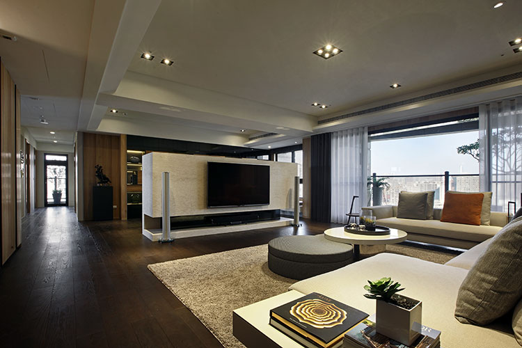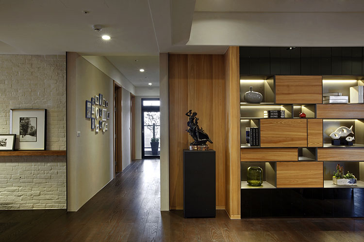 因屋主想保留原有空間屬性又需要開放式空間,因此設計師將客廳與書房之間的隔間改成半高的雙面櫃,形塑出流動且開放的公共空間動線,而私領域則充份隱匿於廊道之間,創造出開闊且視野通透的人文住宅氣息。玄關以大理石馬賽克磚結合木質牆面與大面灰鏡,營造出過道的本質以及具休閒感的空間調性,灰鏡亦擔任使陽台光線、視野與天際線延伸的重要元素,而在銜接玄關與客廳的過渡場域,設計師也以木質框架揉合中國傳統住宅裡二進式概念,織構出無形的居住意識。