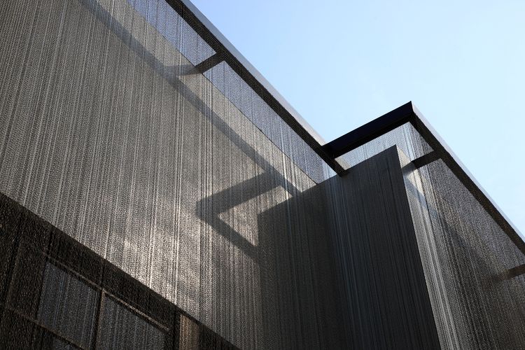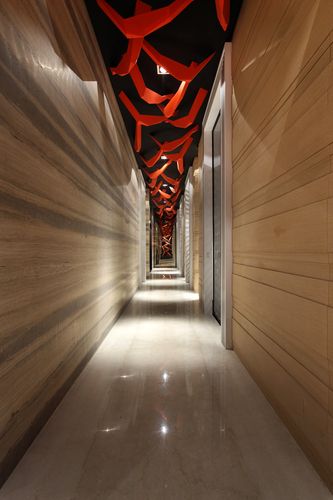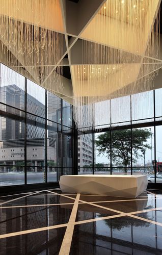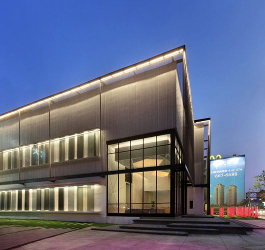 翻轉一般接待中心其封閉呆板的制式印象,在外觀白色方盒子立面,拉起上萬條金屬鐵鏈,宛如細密織紗,包覆著硬朗物件,柔軟而神祕的薄膜,如霧中風景,引人上前狹近,趨探。千絲萬縷,成了接連內外空間的線索,大廳光纖的垂吊,在幾何分割的天地軸線上,絲絲如雨下,在屏息的靜置空間之中,傾注了,澆灌了,闊散的,不安定的水分子,光分子,閃閃爍爍,躍動的星星,ㄧ傾臨降在肅靜的氛圍中。把接待中心光線最好的位置,留給了深深長廊末端的藝術裝置,黑色鋪蓋天地,紅色不規則削面切割的塊狀體有序地懸置,銀灰洞石與對應的分割木皮紋理,像是移轉時空的輸送帶,悠悠無盡的歷史感,翻覆於上而紅色軍隊穿越時空帶,蓄勢待發地,在深邃的黑色漩渦裡,運轉行進中。