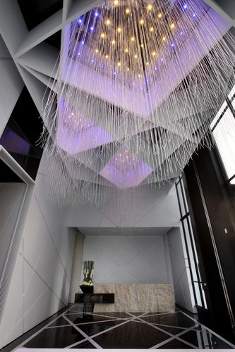 主要建材/ 玻璃、金屬鍊、光纖燈、銀灰洞大理石、木作亮面鋼琴烤漆、石皮、地毯
