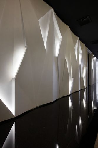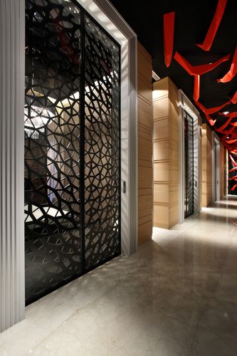 廊道ㄧ旁的門片,從底部開始,由疏而密作幾何切割,冷硬的鐵件織羅起密細的網絲,衝突感隱隱若現,白色燈牆的幾何分割一路延伸至端景,亦趨近於在明暗互疊的秩序中,暗藏著一種靜默的擾動。