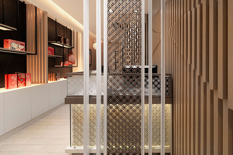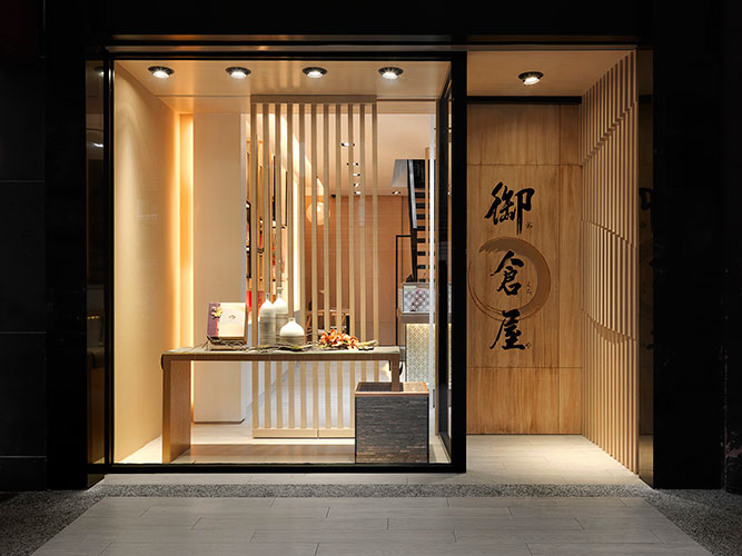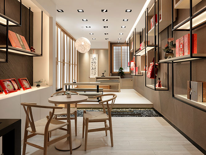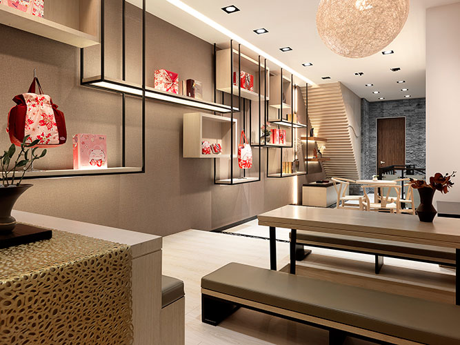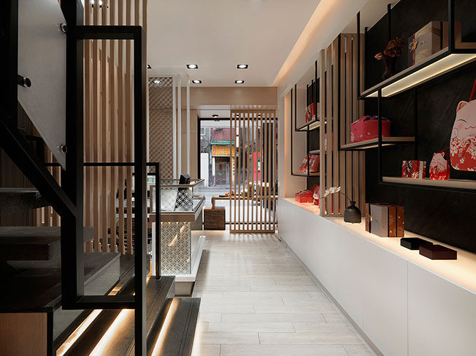 本設計希望在喧鬧的都市中創造一個有文化深度的日式禮餅專賣店,於是採用將整體店內空間分為一、二樓兩個層次的空間策略,同時引入傳統日式茶屋奉茶及款待和菓子的服務氛圍。空間美學上以日本wabi-sabi 佗寂之美的哲學來進行設計;強調自然材質紋理與光影的對話,色彩計劃以大地色系空間襯托粉彩色系的商品與陳列。店內的陳設引入策展的做法,將和菓子職人的文化精神及歷史感器具融入商品陳列之中,創造出主題意境式的美學商業空間。