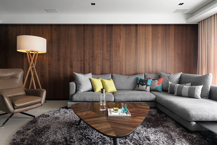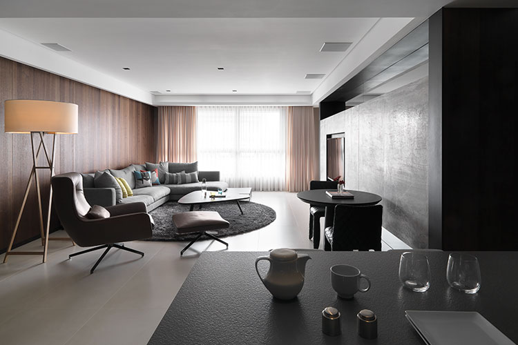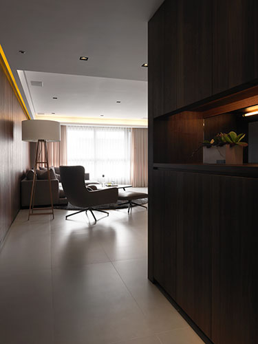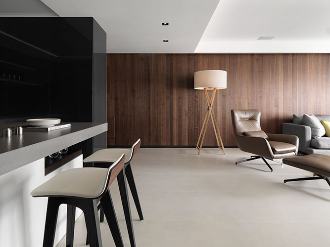 因住宅本身具有良好的採光環境,在從進門開始延續至客廳的主牆面上,特別使用紋理清晰且保有觸感的鋼刷柚木皮引出視覺焦點,配合在側邊窗戶光影照映,特別拉闊其材質的張力。另外木紋主牆對稱的電視牆櫃,則以深色沉重復古面石材作處理,雖隱匿大量的影音與書櫃收納,外表卻保持純粹以對應視覺性十足牆面材。而因兩側牆面壓低整體色調,在天花與地坪上採對比手法去使用半拋面米白色大尺寸石英磚, 讓簡單清晰的天地面容消長性格濃厚的立面色彩,呈現深與淺的絕妙對比,且材質上帶有衝突感但視覺上卻意外和諧,正是「創造粗獷的時尚而非野趣」的設計巧思。