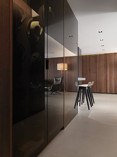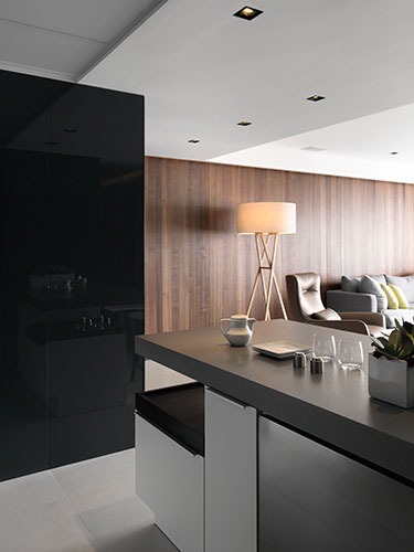 此外,開放式廚房設計簡鍊,特意拉長廚具景寬,牆面材質亦使用黑色烤漆玻璃,除了便於清理的功能外,透過烤漆玻璃反光性特質,讓廚房得以延續客廳空間感,不只造廚具就是家具的形象,更有效消弭空間彼此界線。